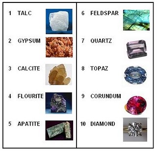 Một số cách đo định lượng độ cứng được tạo ra, nhưng phương pháp scratch hardness (vết trầy xước) được sử dụng trong một thời gian dài bởi các nhà khoáng vật học và cũng đáp ứng tốt cho các nhà ngọc học. Theo phương phát này thì cạnh bén của một khoáng vật đã biết độ cứng mà làm trầy xước bề mặt phẳng của một khoáng vật khác thì nó cứng hơn. Vào năm 1824, nhà khoáng vật học Mohs (Australia) đã chọn 10 khoáng vật tương đối phổ biến và sắp xếp chúng theo thứ tự độ cứng tăng dần từ 1 tới 10 như sau: