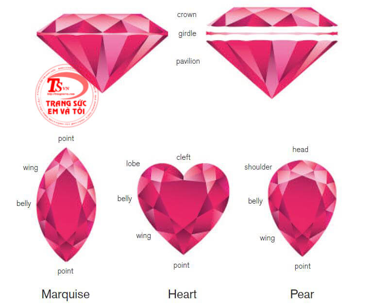 Hầu hết đá quý mài giác đều có 3 phần chính: crown (phần trên), girdle (gờ), và pavilion (phần dưới). Ngoài dạng tròn, những dạng khác thường được ưa chuộng như là: marquise, heart, and pear. |