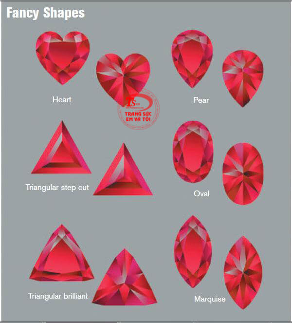 Sau màu sắc, hình dạng và kiểu cắt là hai yếu tố cần chú ý đối với một viên đá màu đã được chế tác. Hình dạng là đường viền bên ngoài của viên đá. Dạng tròn là hình dạng phổ biến nhất. Tất cả các dạng khác thường được gọi là Fancy shape, bao gồm: emerald cut, cushion, antique cushion, oval, pear, marquise, and heart.