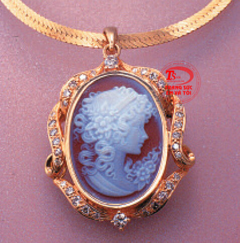 Cameo cũng là một kiểu cắt mài truyền thống, loại cắt mài này thường thể hiện chân dung nhìn nghiêng của người phụ nữ được khắc từ đá quý. Hình trên là mặt dây chuyền cameo được khắc từ sardonyx.C |