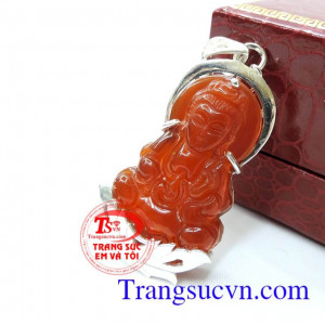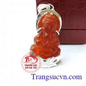 Mặt quan âm mã não đỏ trong, mặt phật quan âm ngự trên tòa sen bạc điêu khắc tinh xảo, đá mã não đỏ biểu tượng của sức khỏe, sự hưng thịnh và trường thọ