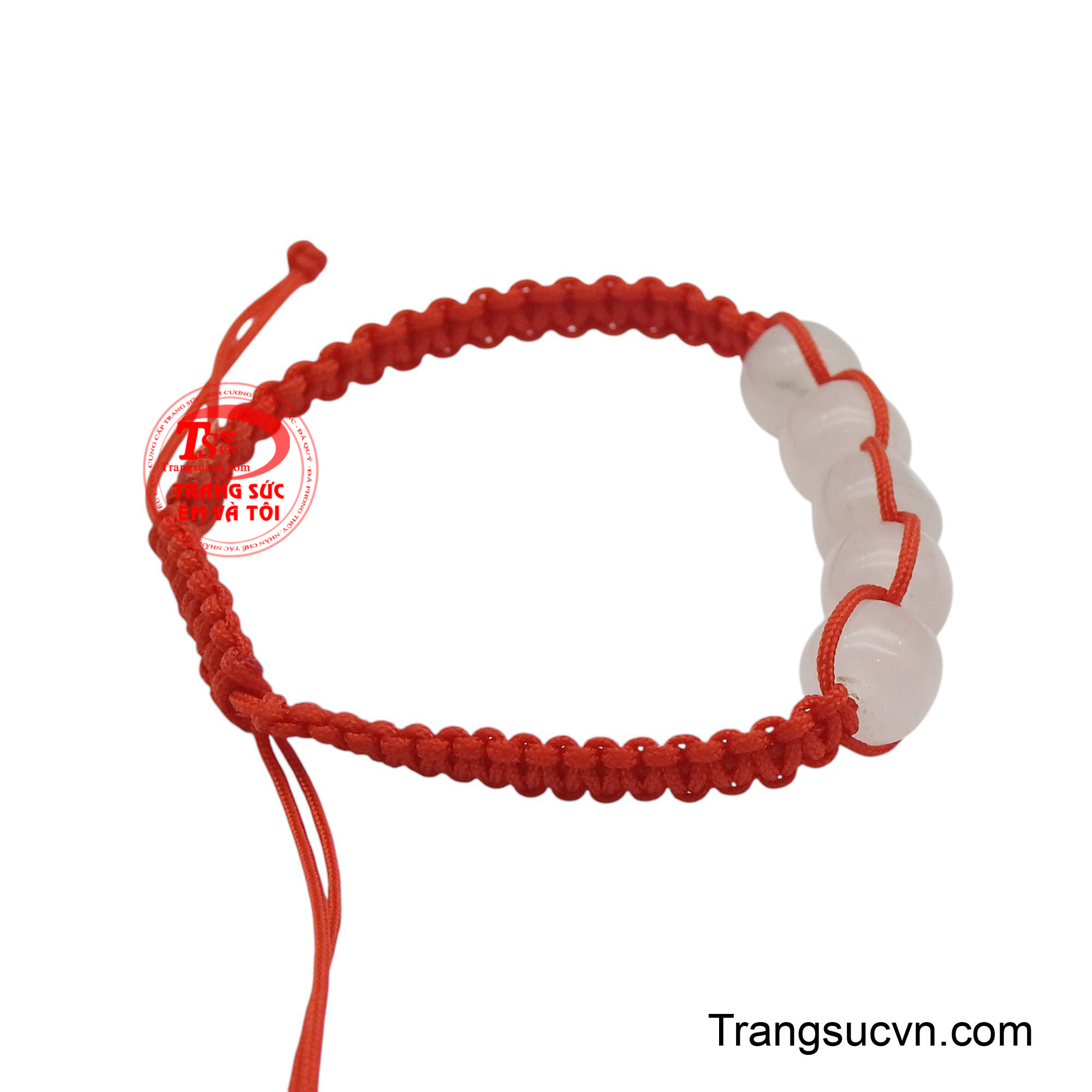 Dây tết ngọc mệnh kim được tết bởi những sợi dây đỏ được tết thủ công tỉ mỉ, tượng trưng cho may mắn, bình an và sự bảo vệ. Điểm nhấn là năm viên ngọc màu trắng đục, mang sắc thái tinh khiết và thanh lịch, được cho là mang lại sự thịnh vượng, cân bằng và hài hòa cho người đeo. Mỗi viên ngọc được cố định khéo léo trên sợi dây, tạo nên sự liền mạch và uyển chuyển. Vòng tay không chỉ là một phụ kiện trang sức đẹp mắt mà còn là một vật phẩm mang ý nghĩa phong thủy sâu sắc, giúp tăng cường năng lượng tích cực và thu hút những điều tốt lành.