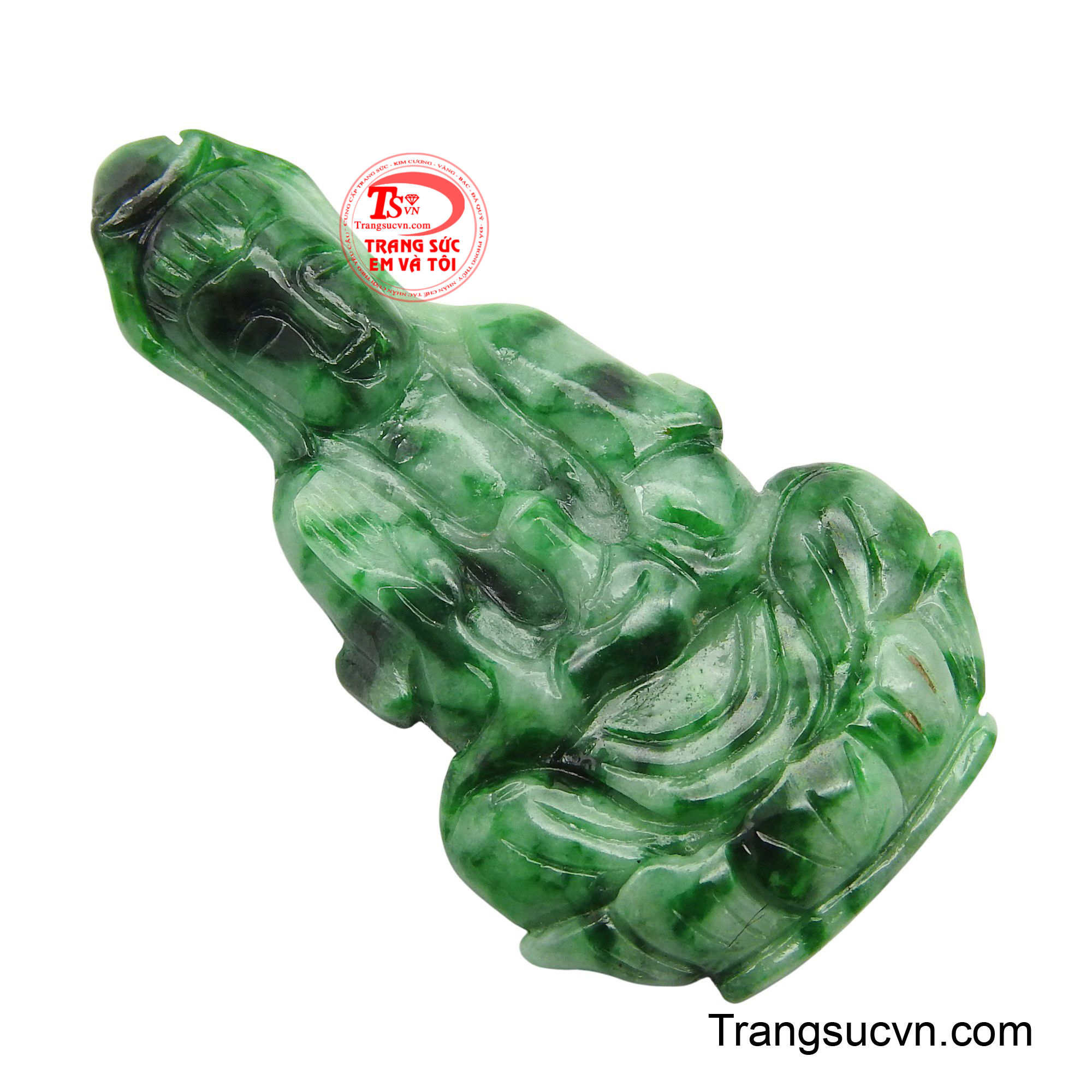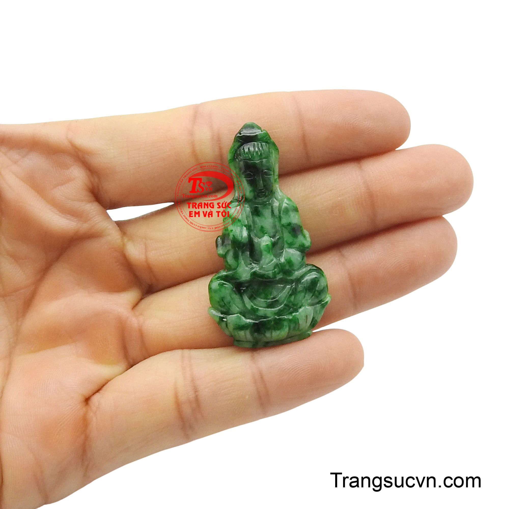 Mặt Phật Bà Ngọc thiên nhiên được chế tác từ Ngọc Jadeite thiên nhiên, toát lên vẻ đẹp thanh tịnh và từ bi sâu sắc. Viên ngọc có sắc xanh lục với các vân mây đậm nhạt, tạo cảm giác như nàng đang an tọa giữa chốn thủy trung. Hình ảnh Phật Bà ngồi trên đài sen, khuôn mặt hiền từ, nhắm mắt tĩnh lặng, tượng trưng cho sự giác ngộ và lòng nhân ái vô hạn. Đeo món trang sức này không chỉ là để làm đẹp, mà còn là để cảm nhận được sự che chở, nuôi dưỡng tâm hồn thiện lương và tìm thấy sự bình yên nội tại.