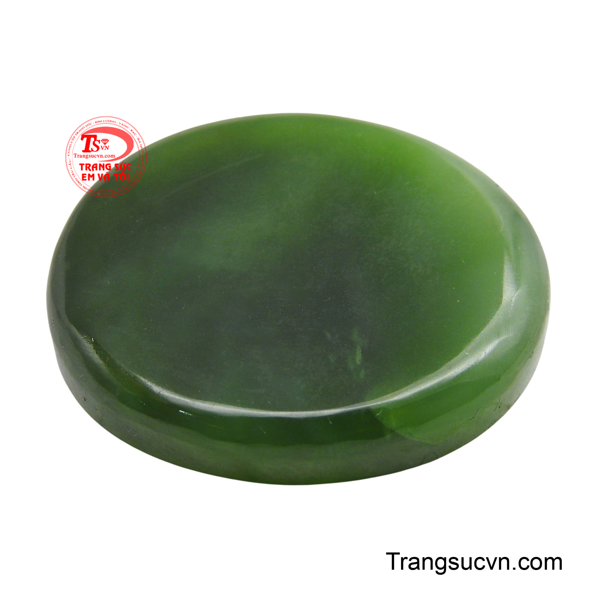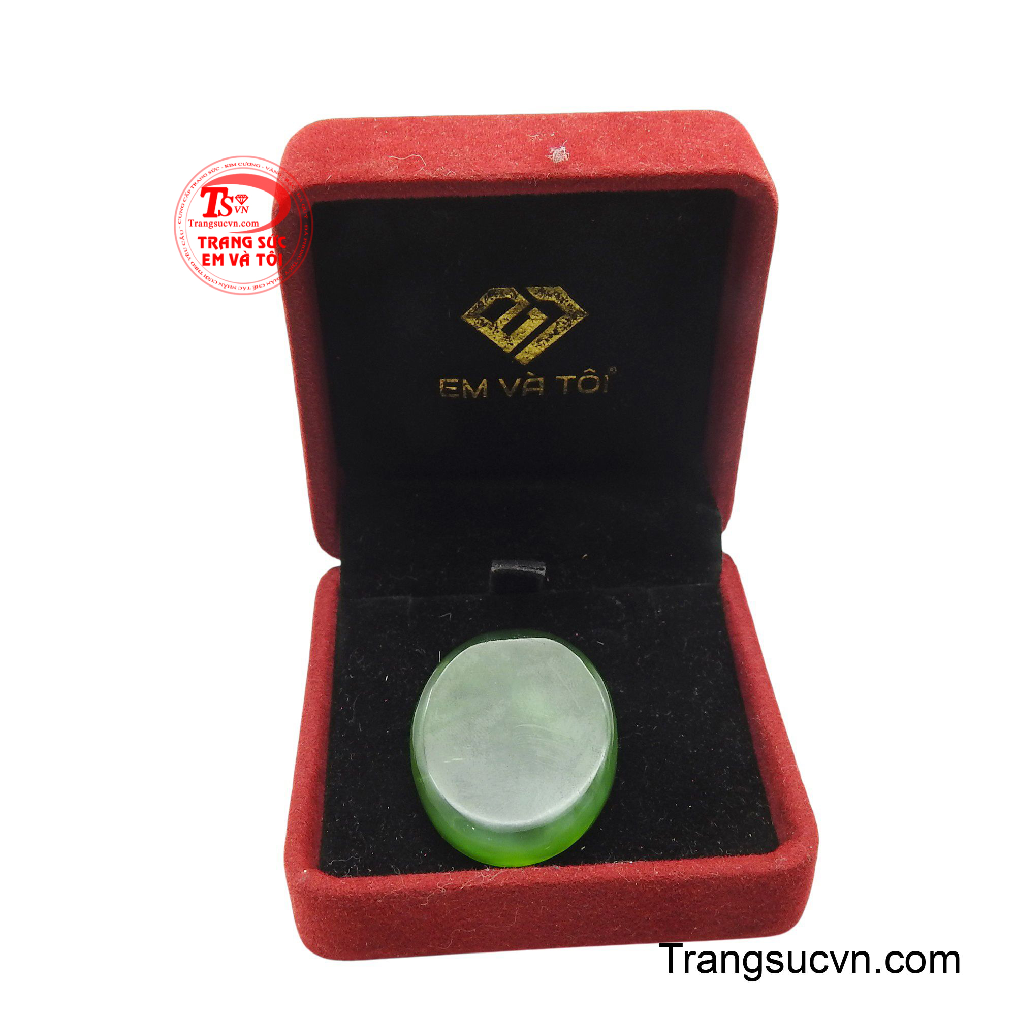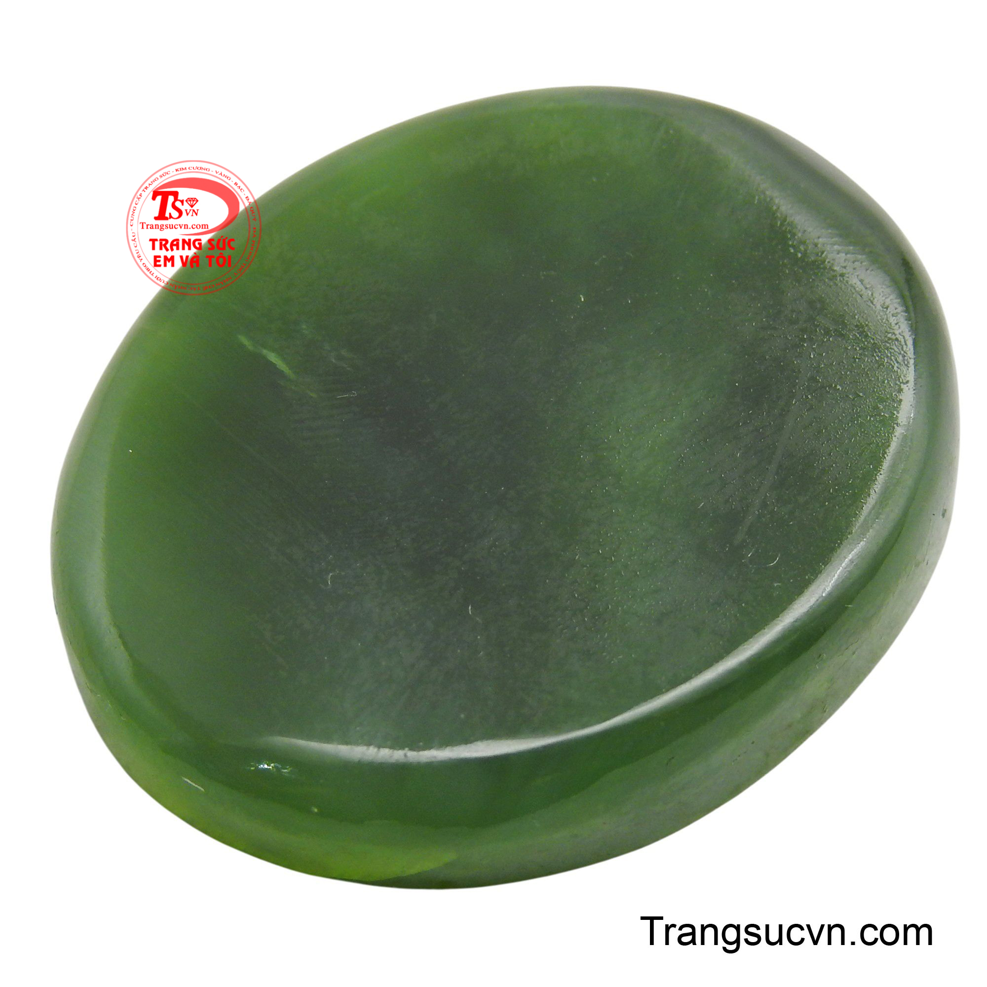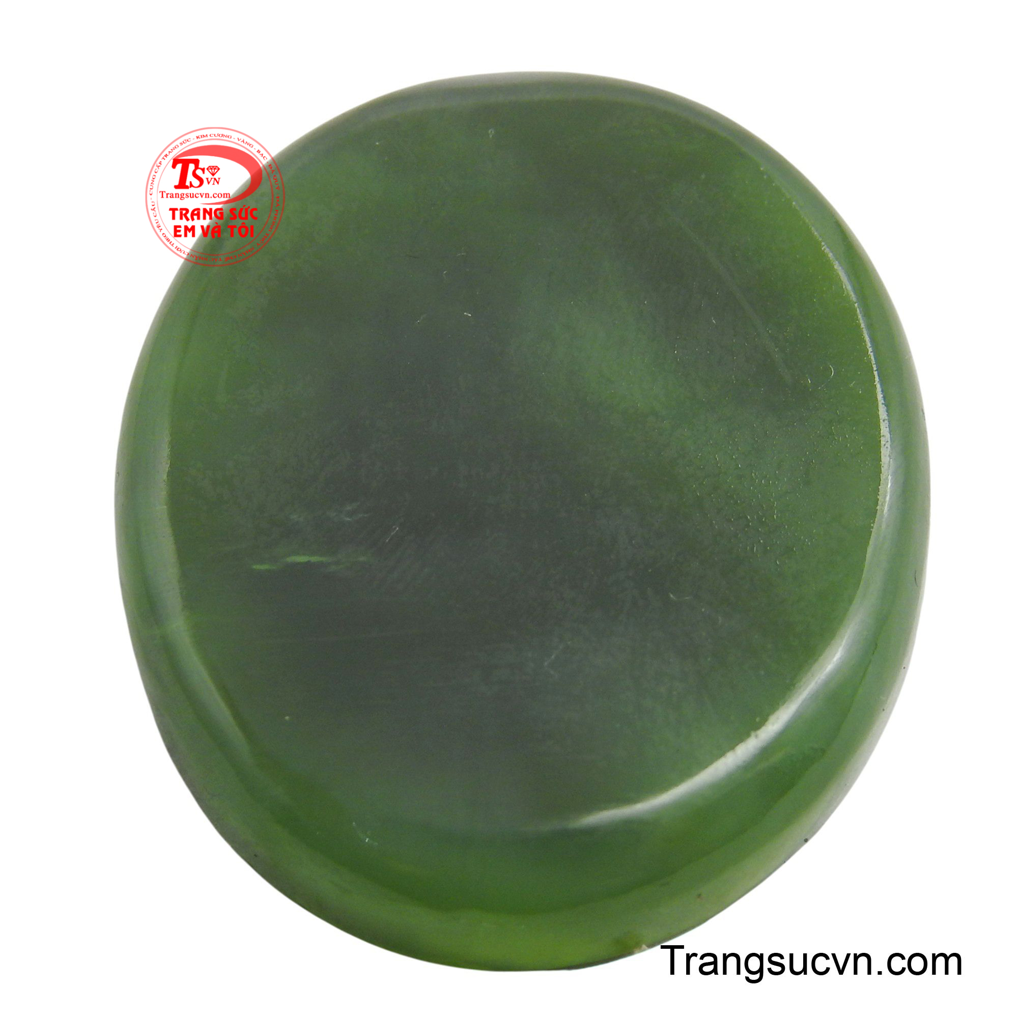 Viên đá có hình bầu dục, được mài bóng nhẵn mịn, phô bày sắc xanh ngọc bích thuần khiết và dịu mát.