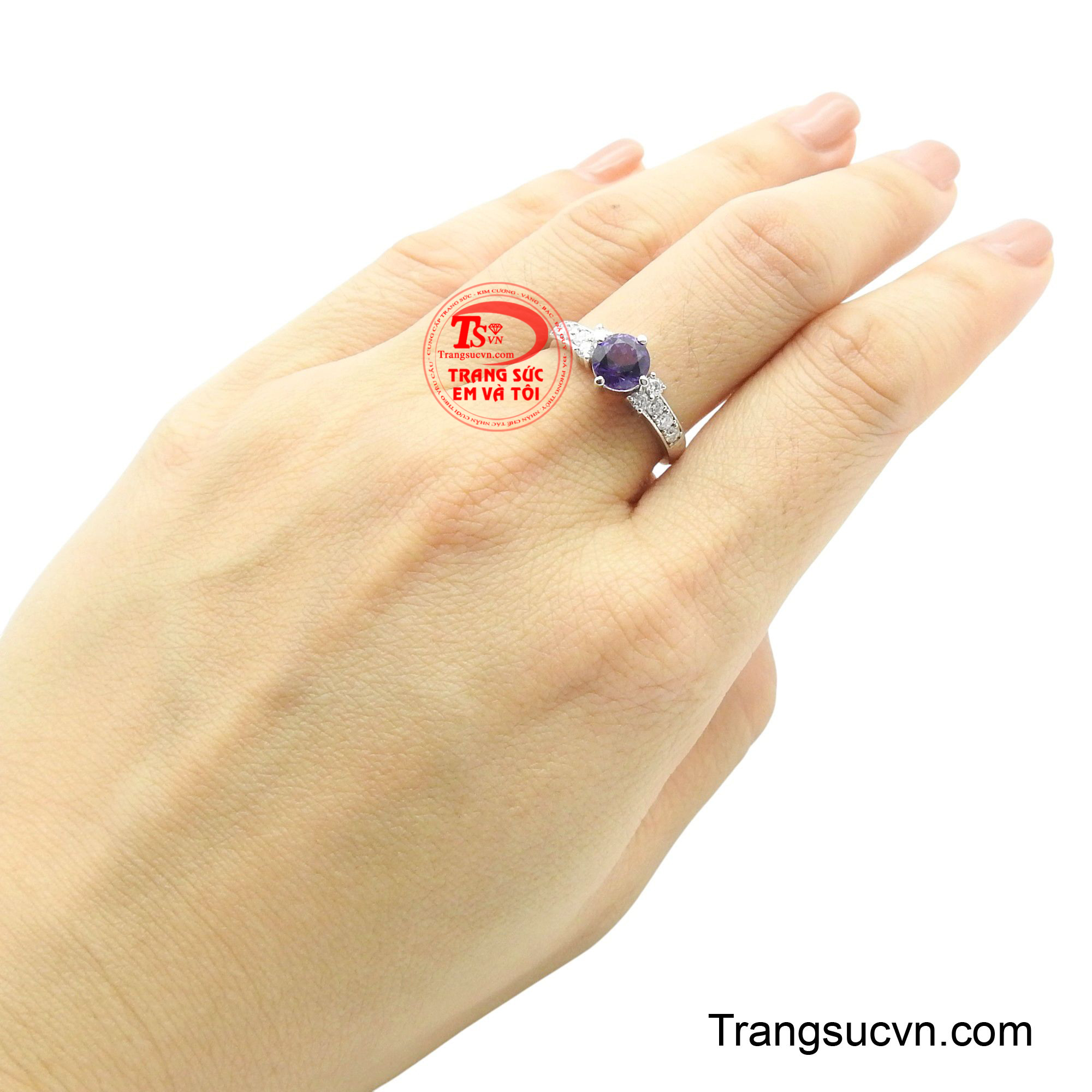 Tâm điểm là viên đá Thạch Anh Tím (Amethyst) hình tròn được cắt mài lấp lánh, mang sắc tím huyền bí và lãng mạn.