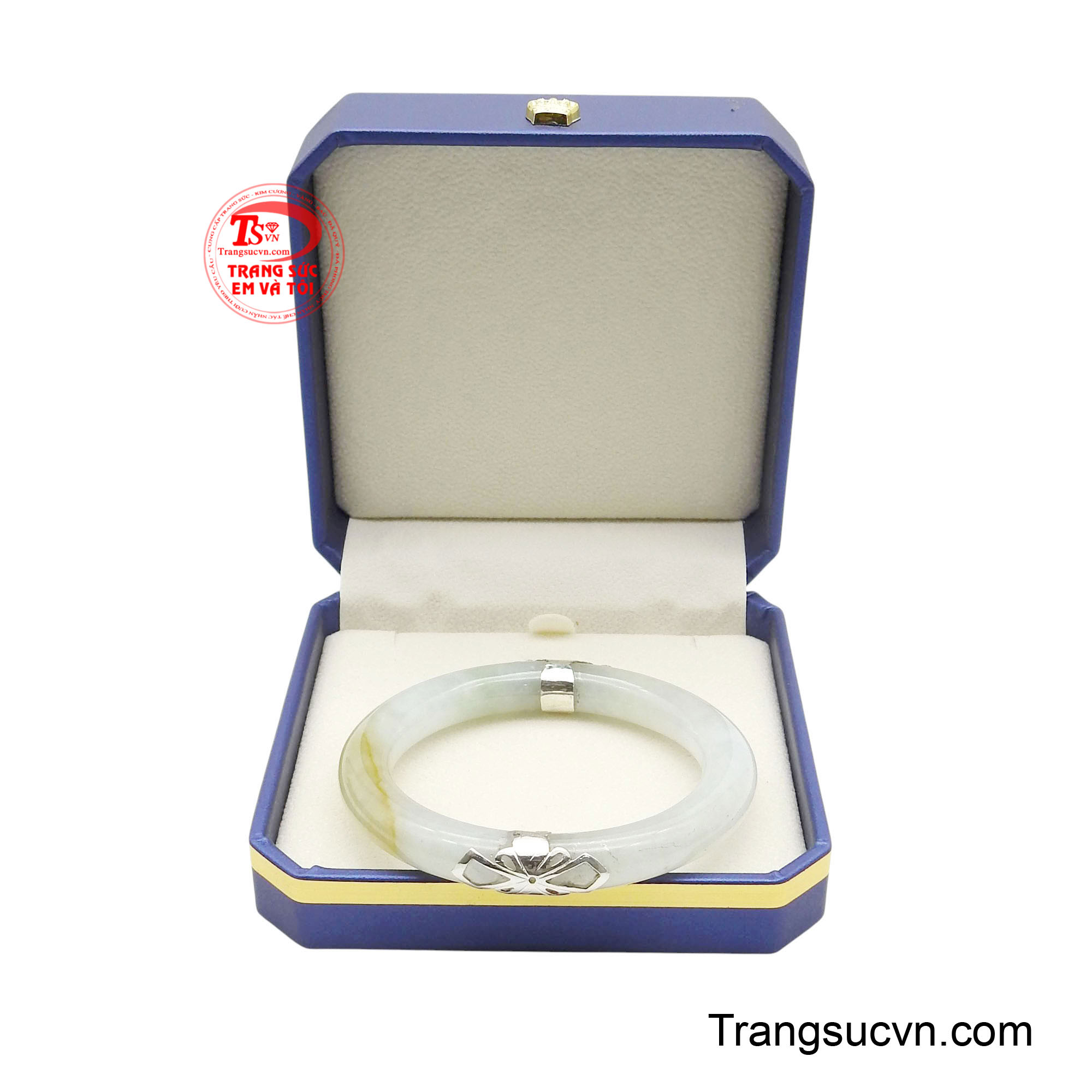 Vòng ngọc bọc bạc phú quý tựa giọt sương đọng trên phiến lá buổi sớm mai, chiếc vòng ngọc bọc bạc không khóa cài mang vẻ đẹp tối giản nhưng thần thái tròn đầy tinh tế. Những vân ngọc trắng lẩn ẩn như mây trời vẽ trên nền ngọc thuần khiết, mang đến cảm giác thanh tao, trầm tĩnh và sang trọng không phô trương. Đường bạc tinh luyện ôm lấy ngọc đóa hoa quấn quanh vầng trăng sớm, tinh xảo mà nhẹ nhàng, tạo nên nét đẹp hài hòa tuyệt mỹ. Vòng được chế tác liền mạch, ôm cổ tay mềm mại, gợi cảm giác an yên như đeo lên tay cả trời phú quý, vượng khí nhẹ nhàng chảy vào từng nhịp thở.