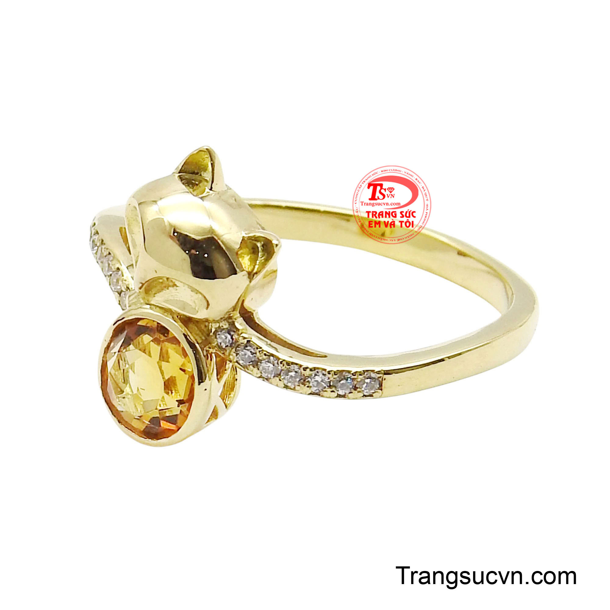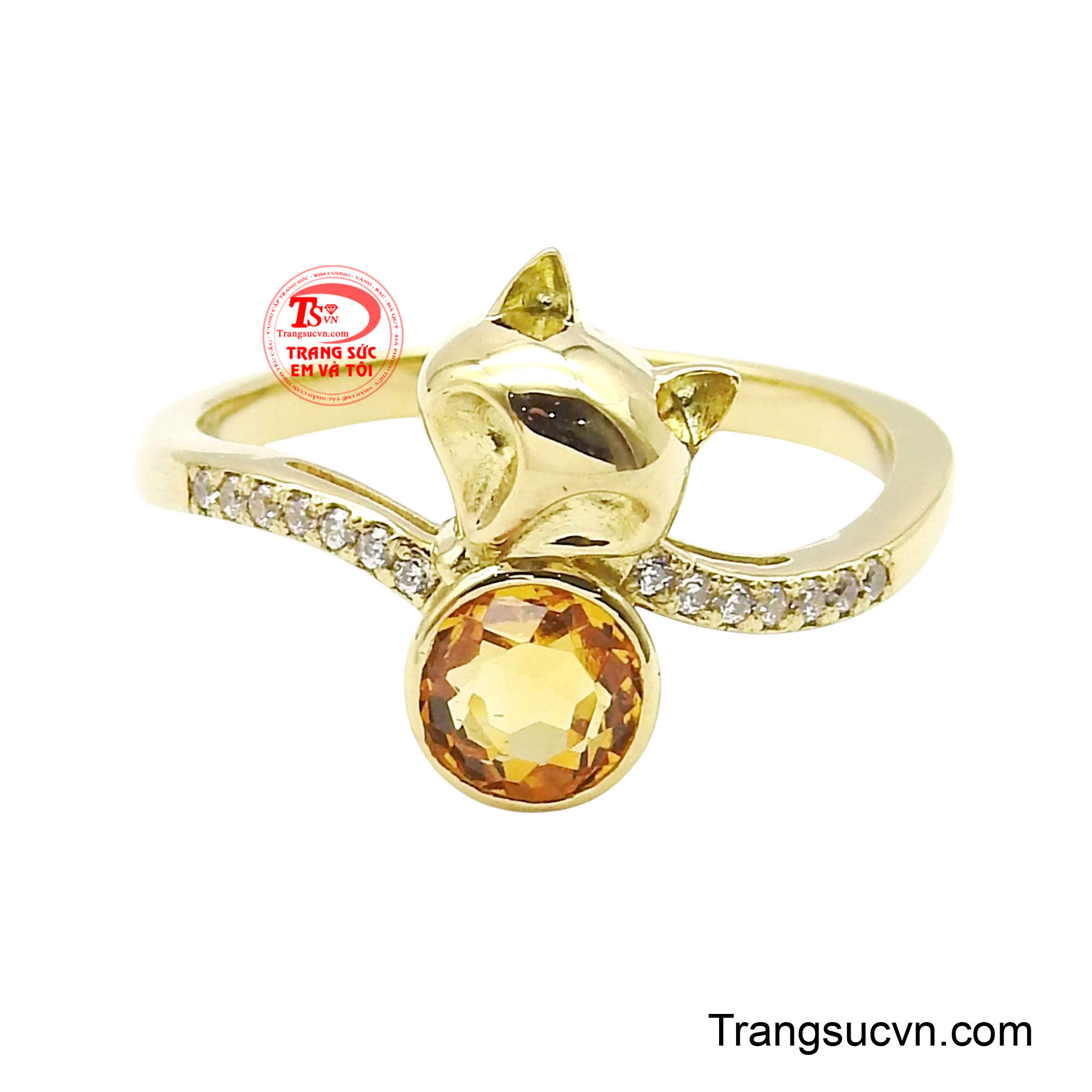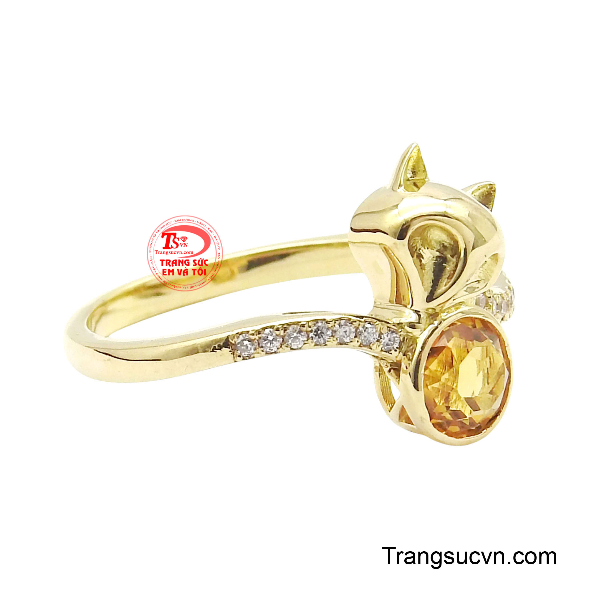 Nhẫn được chế tác từ vàng18k lấp lánh, nổi bật với chi tiết chạm khắc hình hồ ly và viên đá Thạch Anh màu vàng cam rực rỡ ở trung tâm.