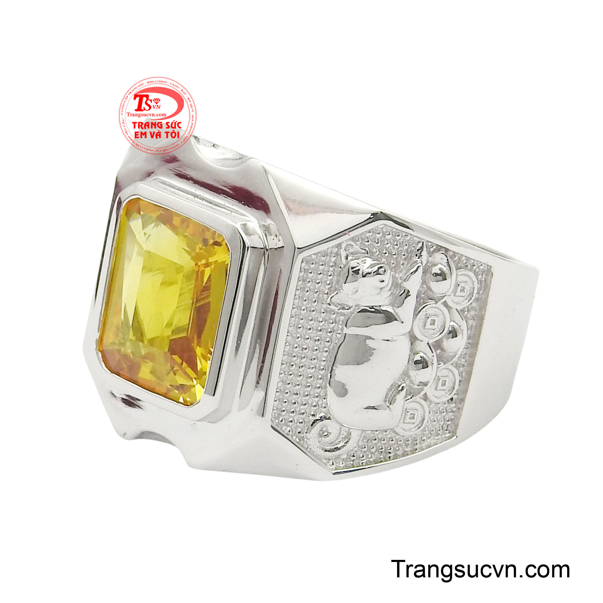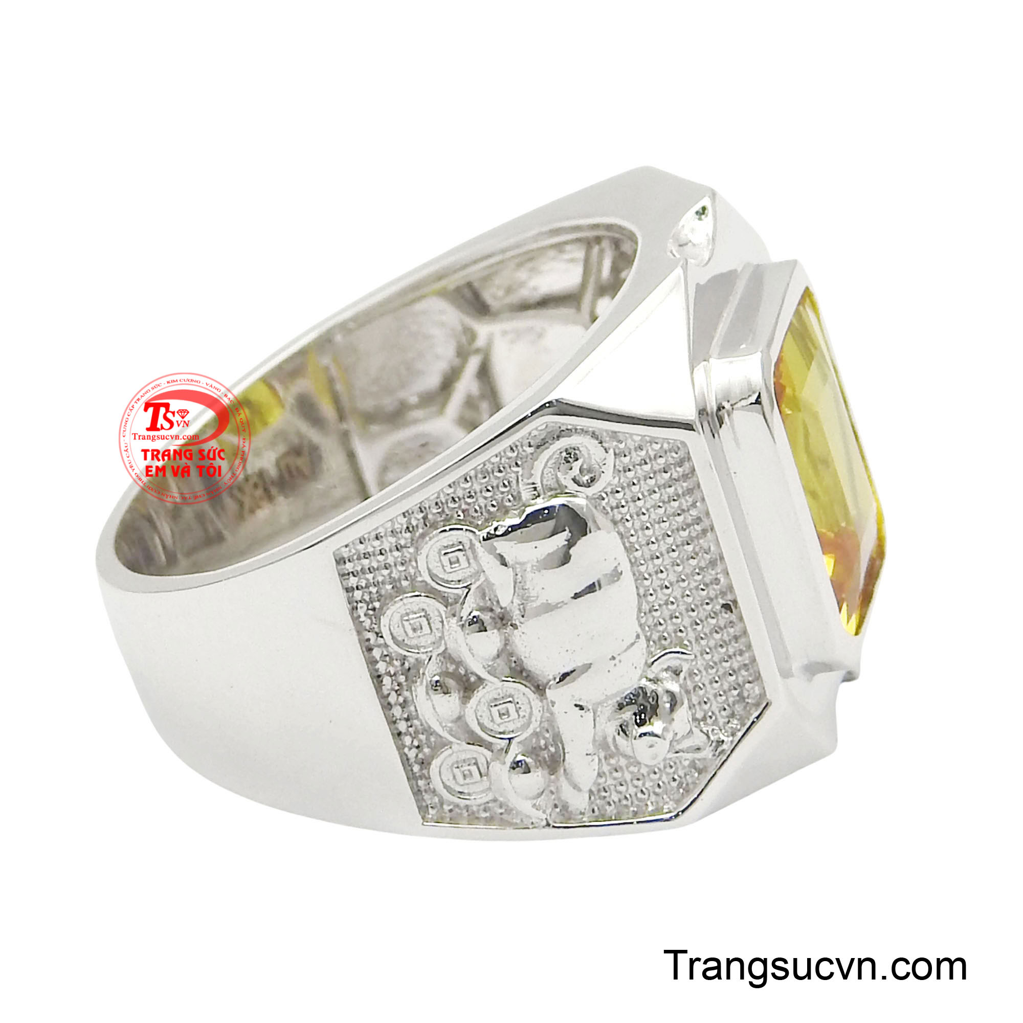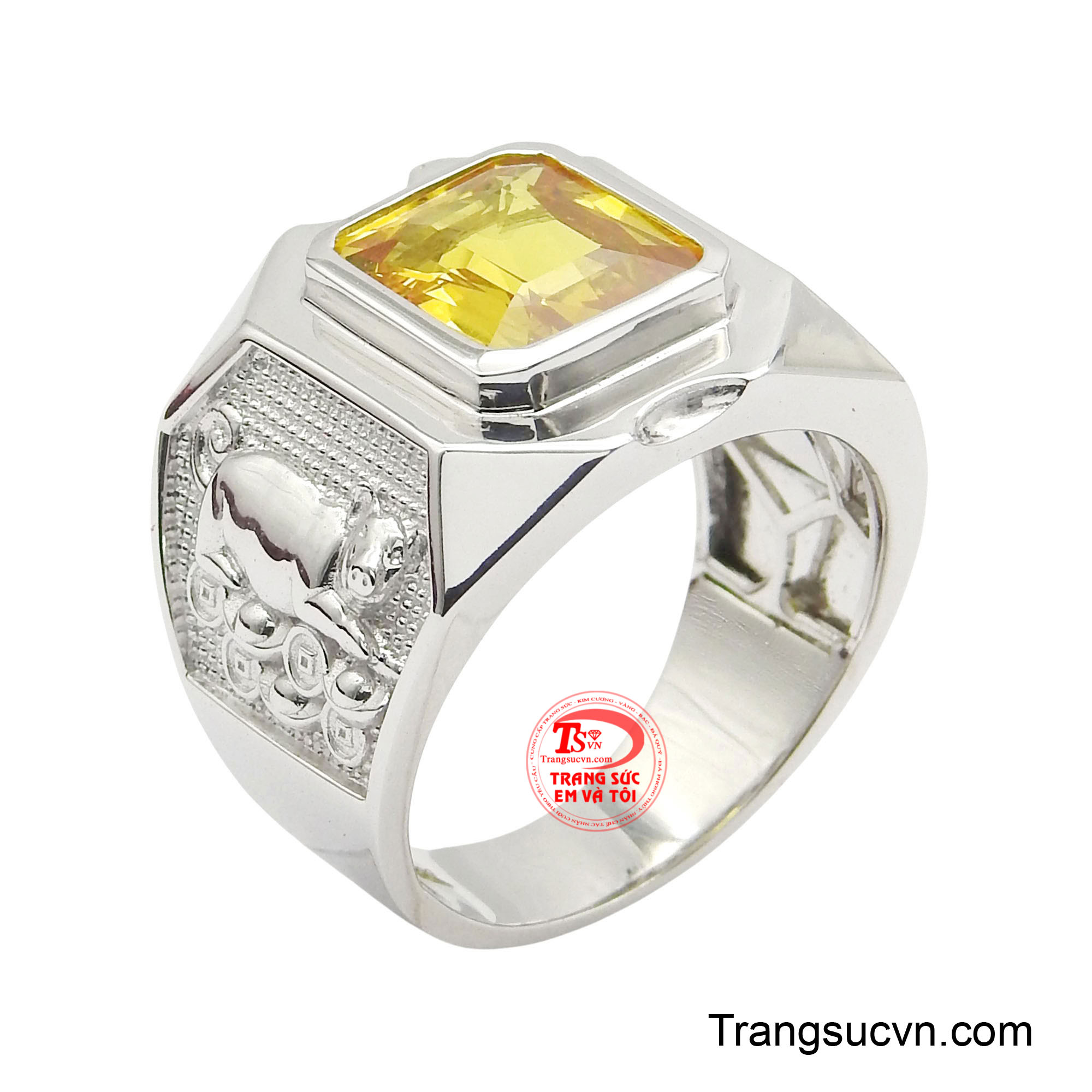 Nhẫn sapphire nam thời thượng là một tuyên ngôn về sự mạnh mẽ và đẳng cấp của người đàn ông hiện đại. Nhẫn được chế tác từ vàng trắng 18k với tâm điểm là viên đá Sapphire vàng được cắt vuông vức, nổi bật với màu vàng rực rỡ, tượng trưng cho uy quyền và sự thịnh vượng. Hai bên nhẫn được chạm khắc họa tiết linh vật và đồng tiền tinh xảo, làm tăng thêm ý nghĩa tài lộc và thành công cho người sở hữu. Sở hữu chiếc nhẫn này giúp các anh thêm tự tin và khẳng định mình.