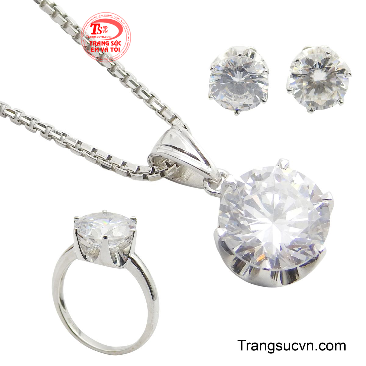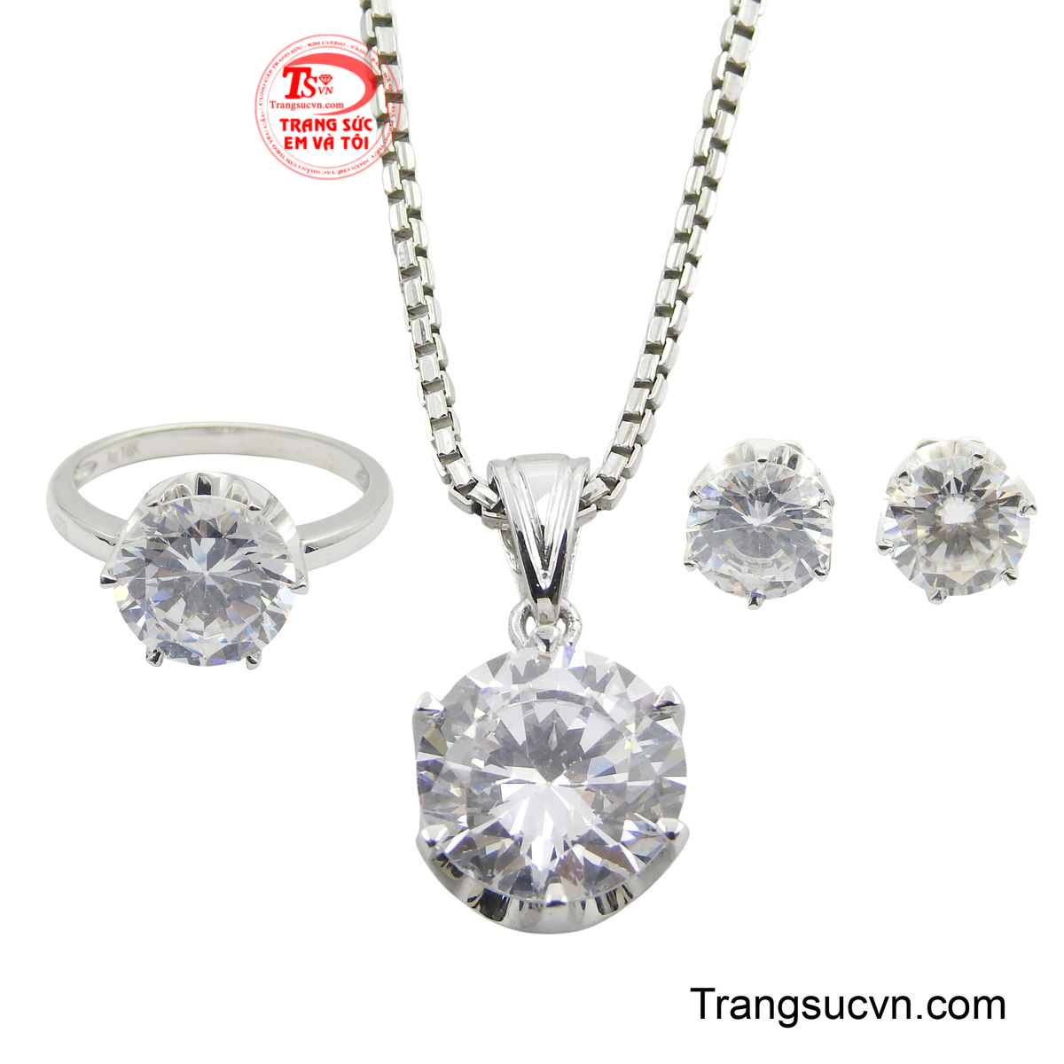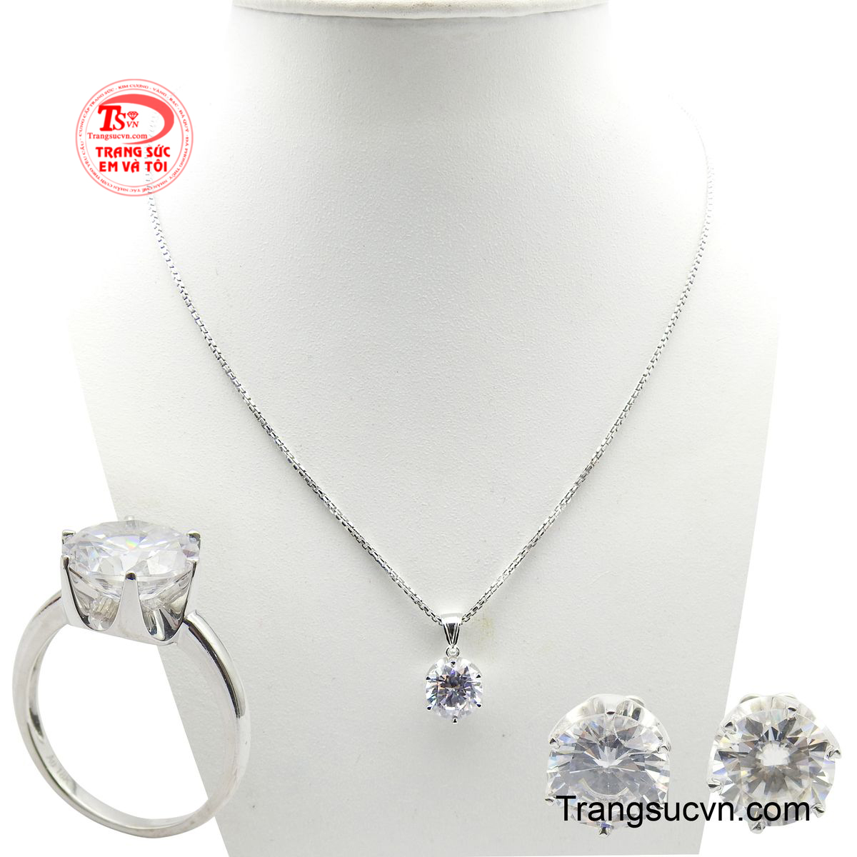 Được chế tác từ vàng trắng bộ trang sức nổi bật với thiết kế cổ điển, đặt viên đá chủ trắng rực rỡ ở vị trí trung tâm nhưng vẫn mang lại sự cuốn hút cho người đeo.