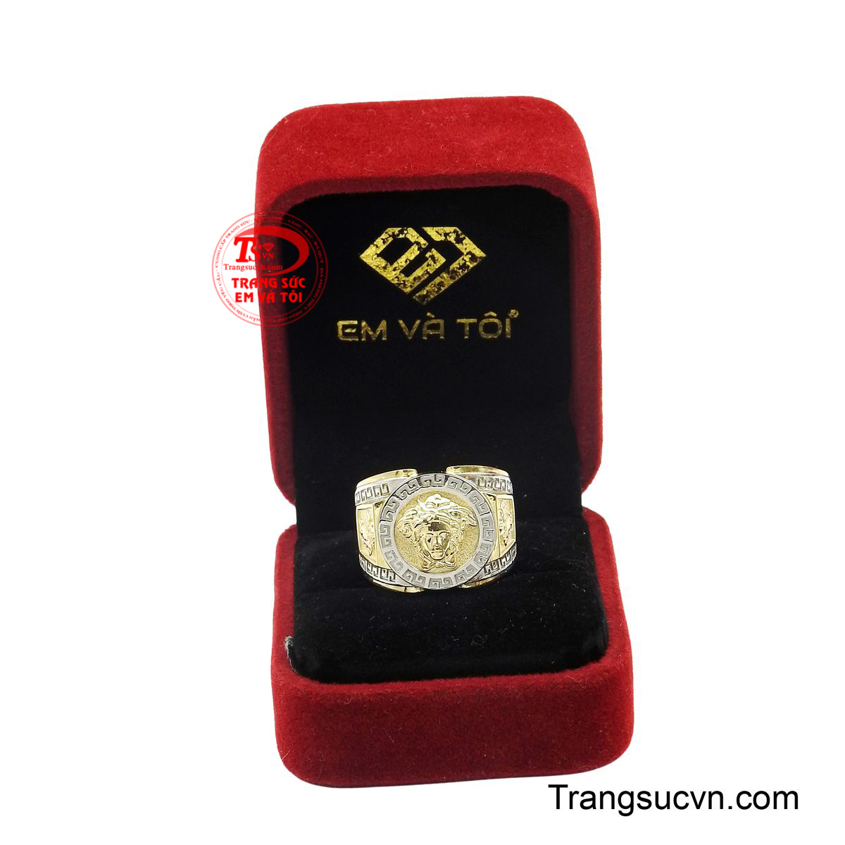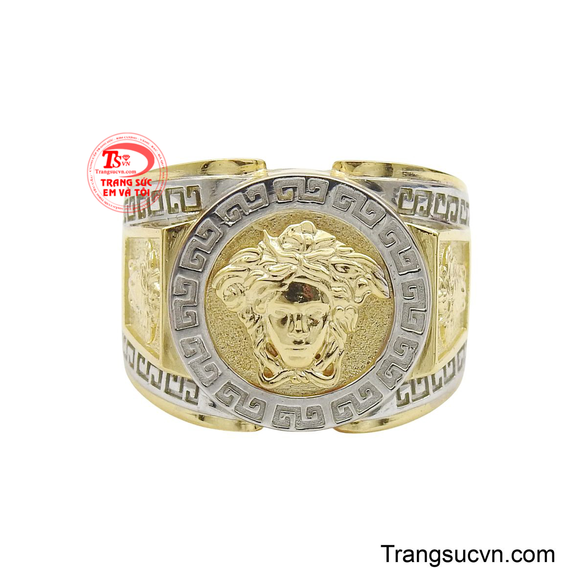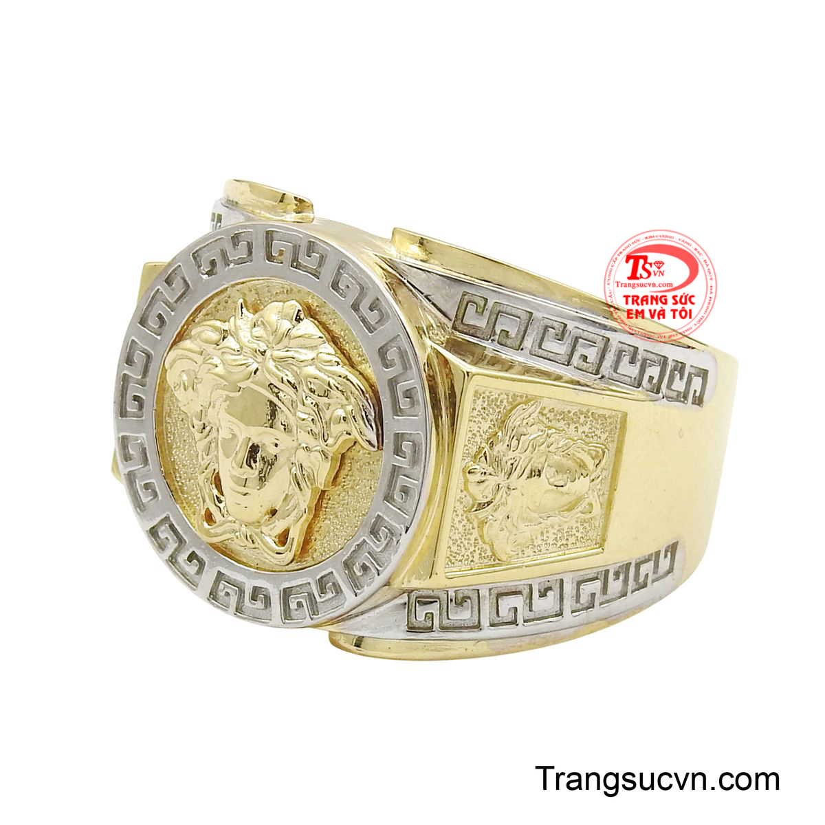 Nhẫn được chế tác từ vàng 10k bản lớn, nổi bật với họa tiết đầu Medusa của Versace ở trung tâm, tượng trưng cho uy quyền và sự lôi cuốn mãnh liệt.
