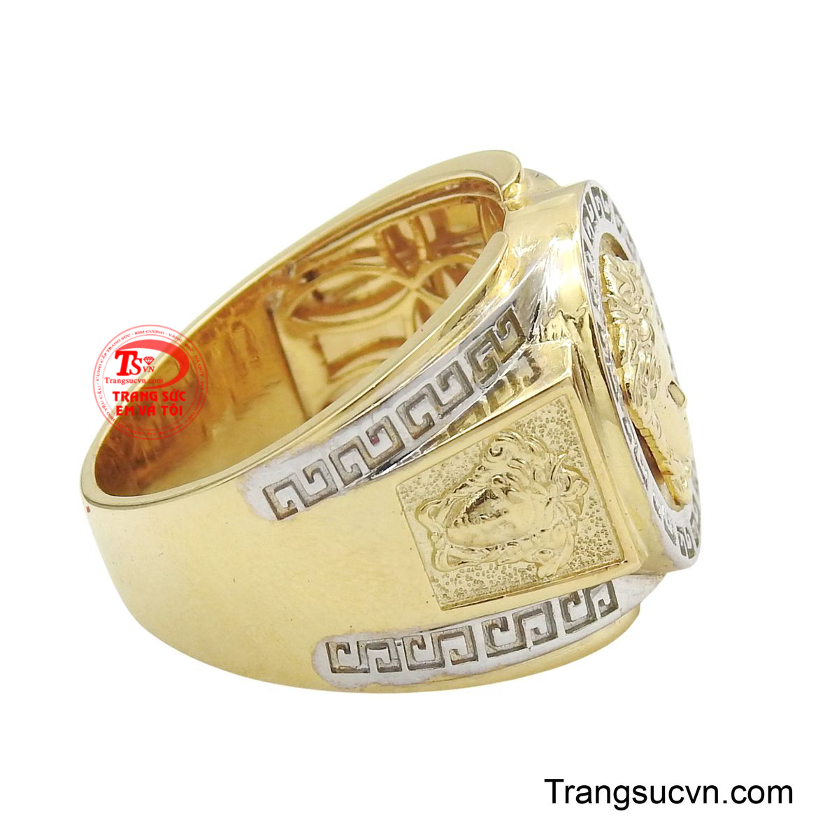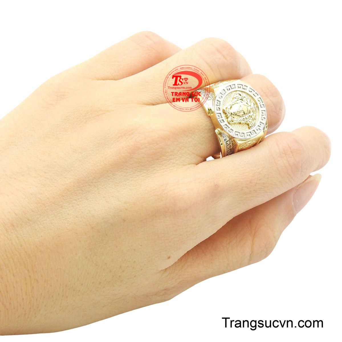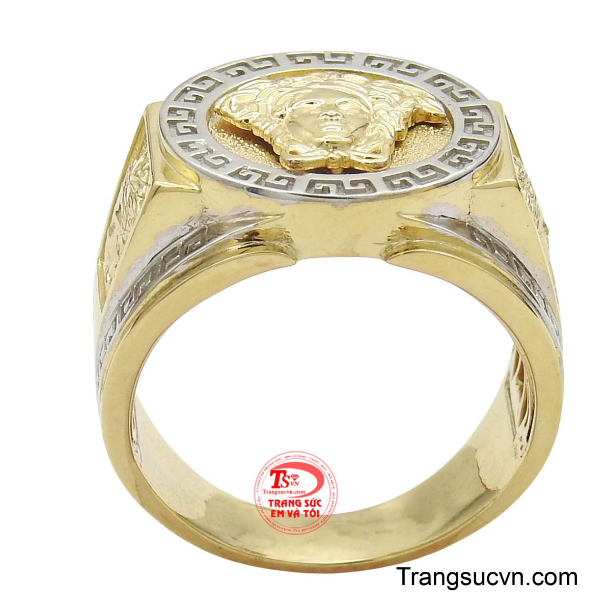 Nhẫn được chế tác từ vàng 10k bản lớn, nổi bật với họa tiết đầu Medusa của Versace ở trung tâm, tượng trưng cho uy quyền và sự lôi cuốn mãnh liệt.