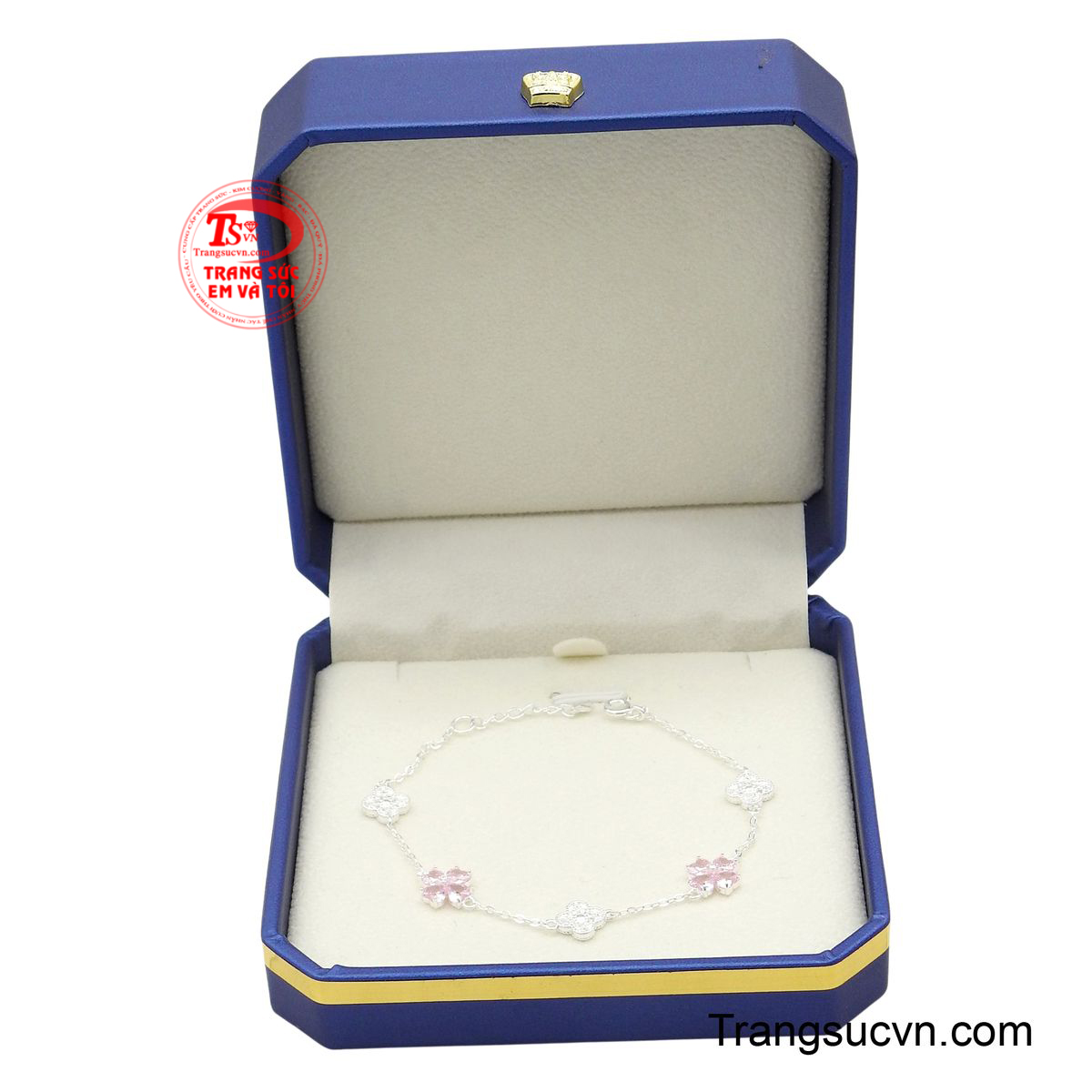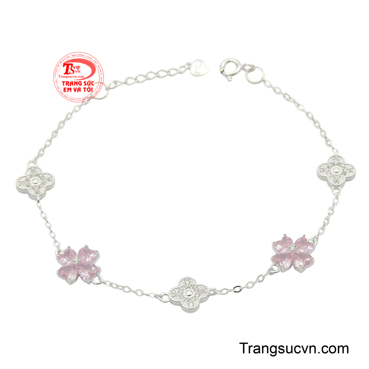 Lắc tay nữ bạc duyên dáng là một thiết kế duyên dáng và lãng mạn tuyệt đối, làm nổi bật vẻ đẹp cổ tay của người phụ nữ. Chiếc lắc được làm từ bạc ta nguyên chất với sợi dây xích mảnh, kết nối bởi các mặt charm bốn cánh hoa xinh xắn. Các mặt charm này xen kẽ giữa loại nạm đá trắng lấp lánh và loại nạm đá màu hồng dịu nhẹ, tạo nên sự tương phản tinh tế và nữ tính. Món trang sức này không chỉ là biểu tượng của may mắn và tình yêu, mà còn mang lại phong thái ngọt ngào, thanh thoát cho người đeo.
