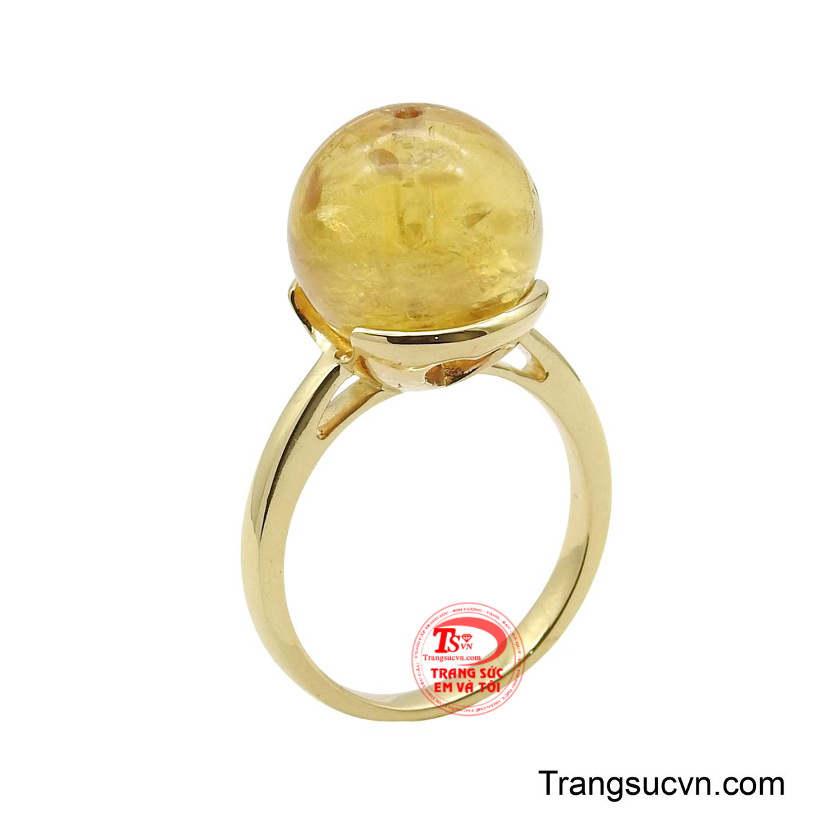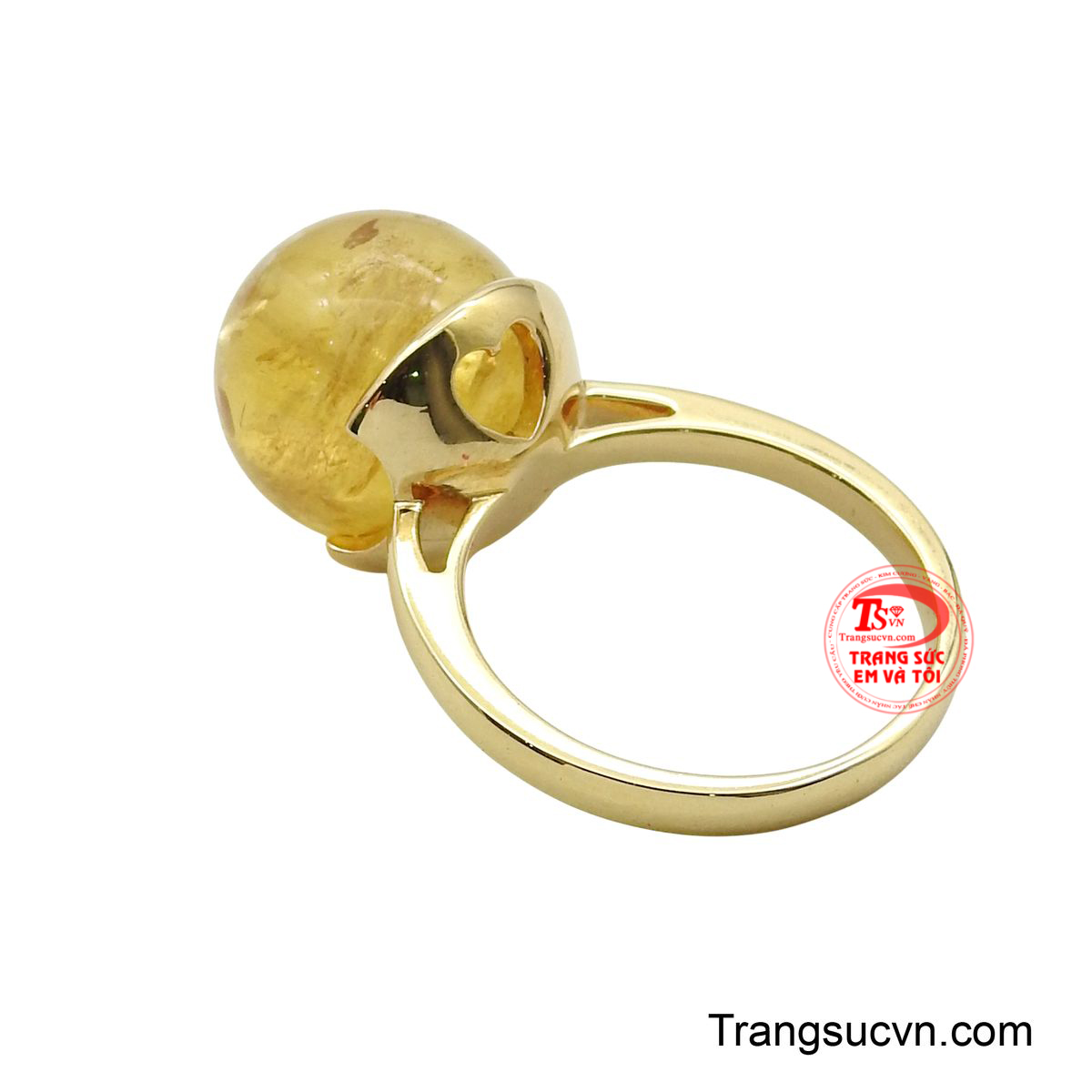 Nhẫn nữ thạch anh tinh tế được chế tác từ vàng 14k sáng bóng, thiết kế nổi bật với viên đá Thạch Anh màu vàng rực rỡ cắt dạng Cabochon lớn ở trung tâm, phô bày sắc thái ấm áp và lung linh như ánh nắng.