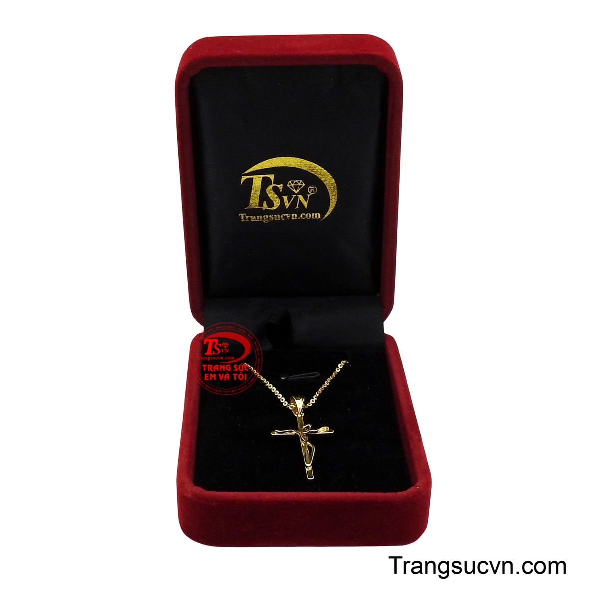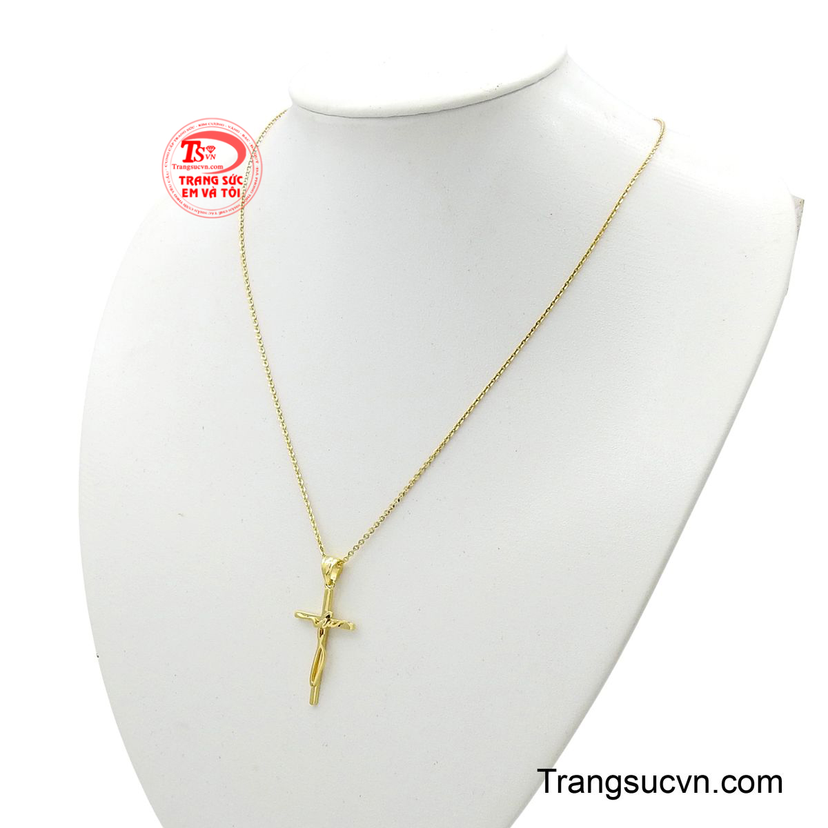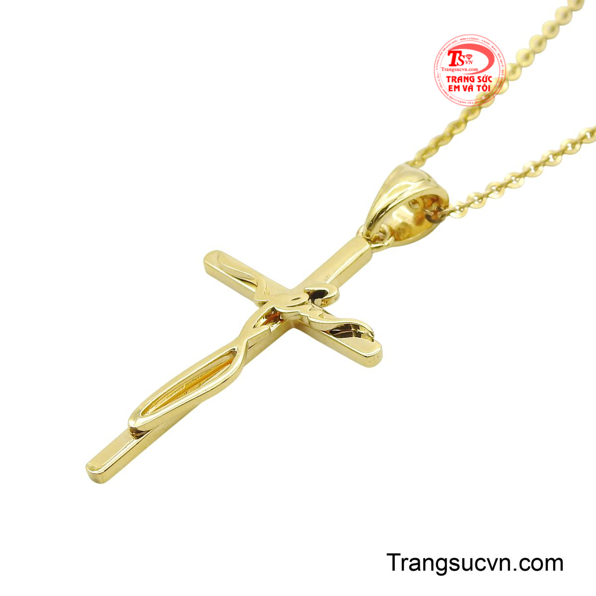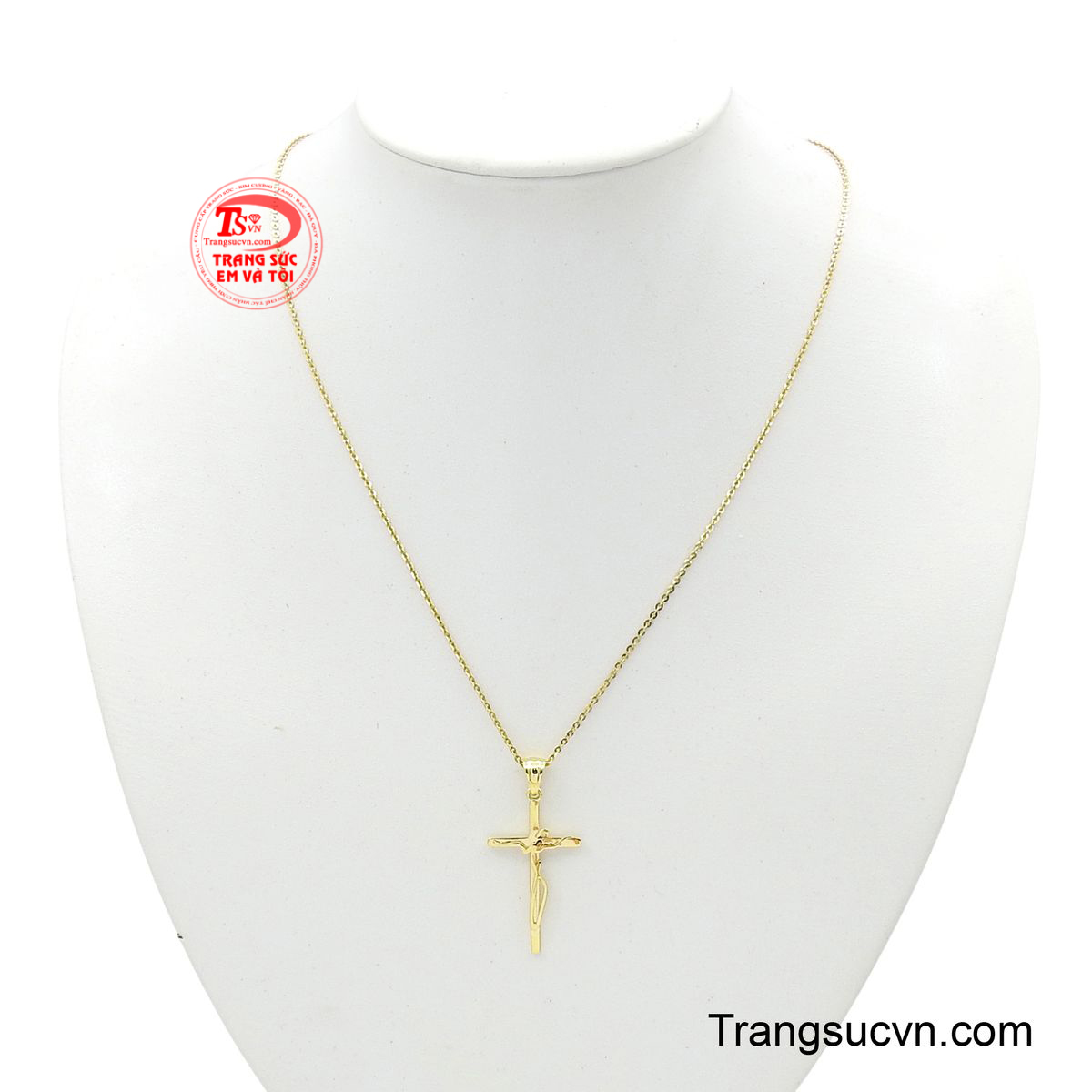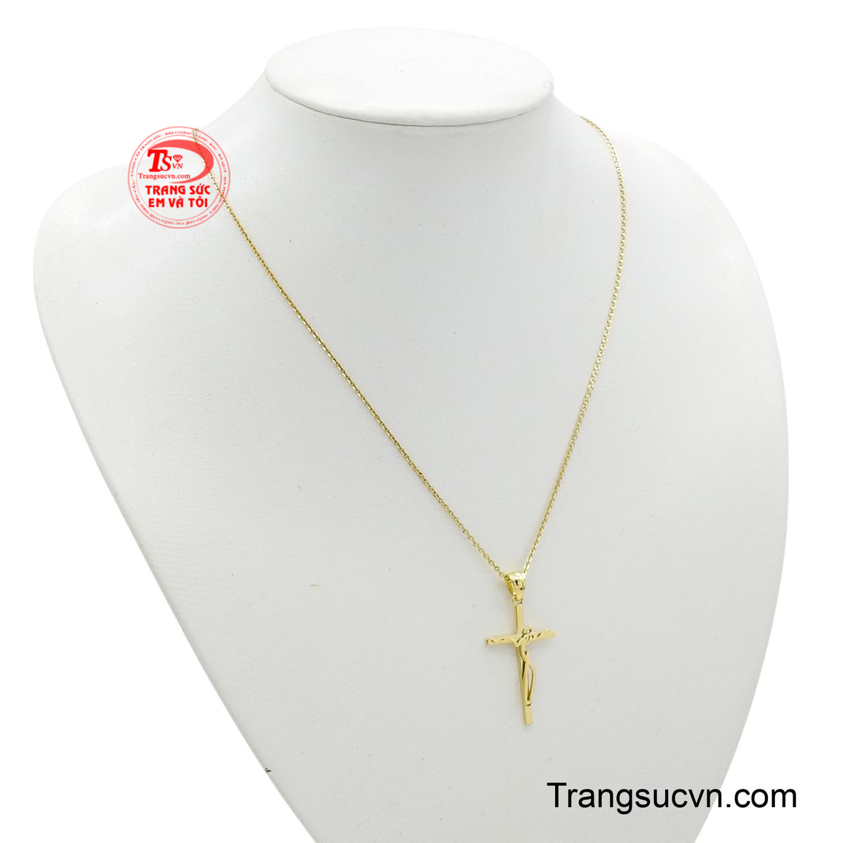 Sợi dây chuyền vàng tây óng ánh nâng đỡ mặt Thánh Giá Chúa chịu nạn, một biểu tượng vĩnh cửu của sự hy sinh và tình yêu thương vô điều kiện.