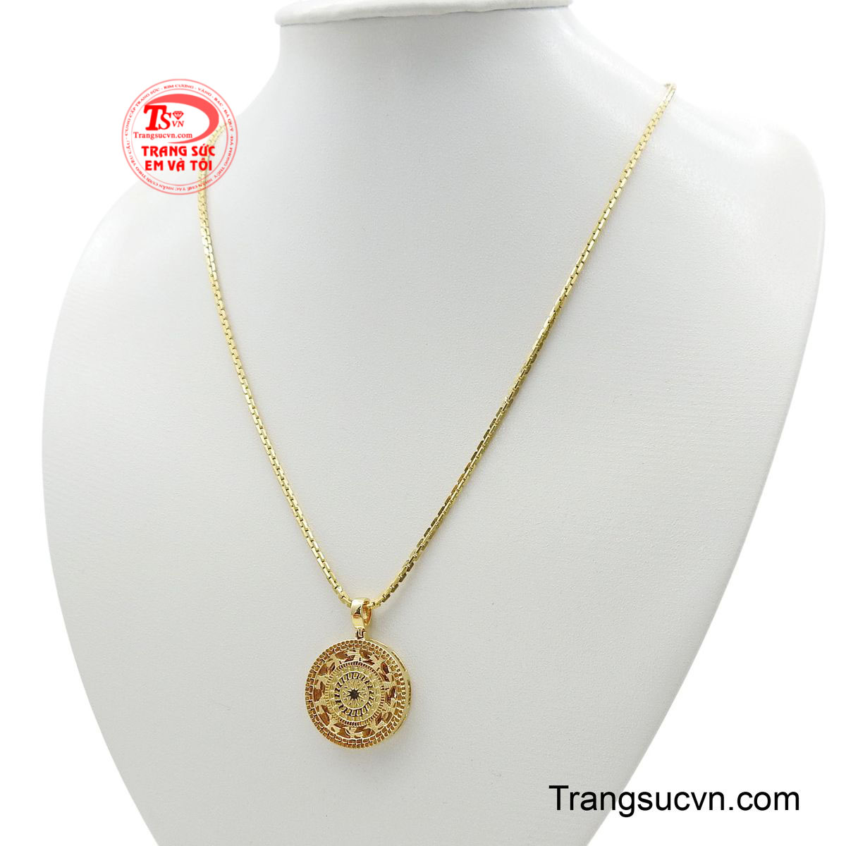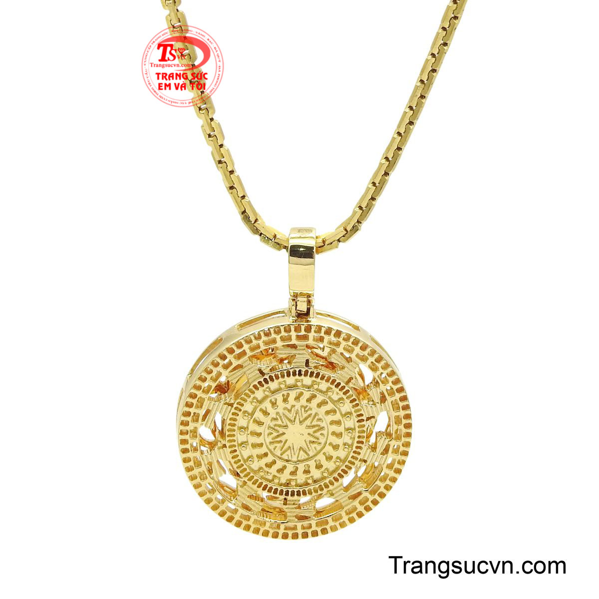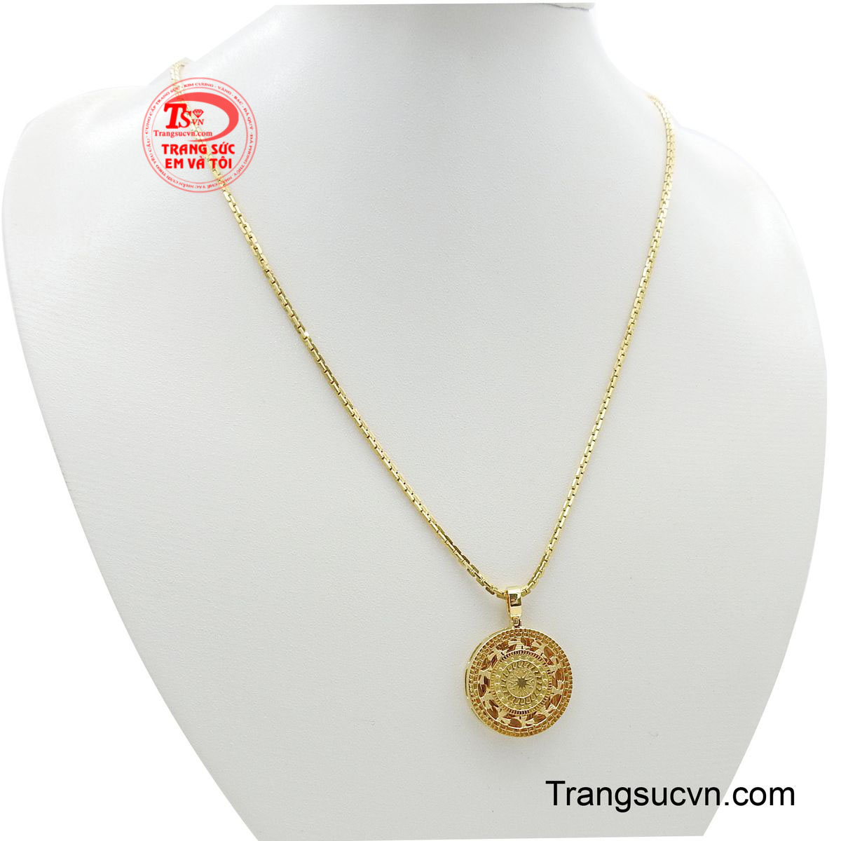 Bộ dây chuyền khí chất nổi bật với sợi dây vuông chắc chắn, từng mắt xích đều đặn tạo cảm giác mạnh mẽ và sang trọng khi đeo trên cổ. Kết hợp cùng mặt dây tròn họa tiết Đông Sơn tinh xảo, tổng thể mang vẻ đẹp hài hòa giữa truyền thống và phong cách hiện đại. Ánh vàng ấm áp lan tỏa, giúp tôn lên khí chất tự tin và bản lĩnh của người sở hữu. Khi chuyển động, dây và mặt dây phản chiếu ánh sáng đầy cuốn hút, tạo điểm nhấn tinh tế cho mọi trang phục. Đây không chỉ là một bộ trang sức, mà còn là tuyên ngôn phong cách dành cho những ai yêu giá trị bền vững và chiều sâu văn hóa.