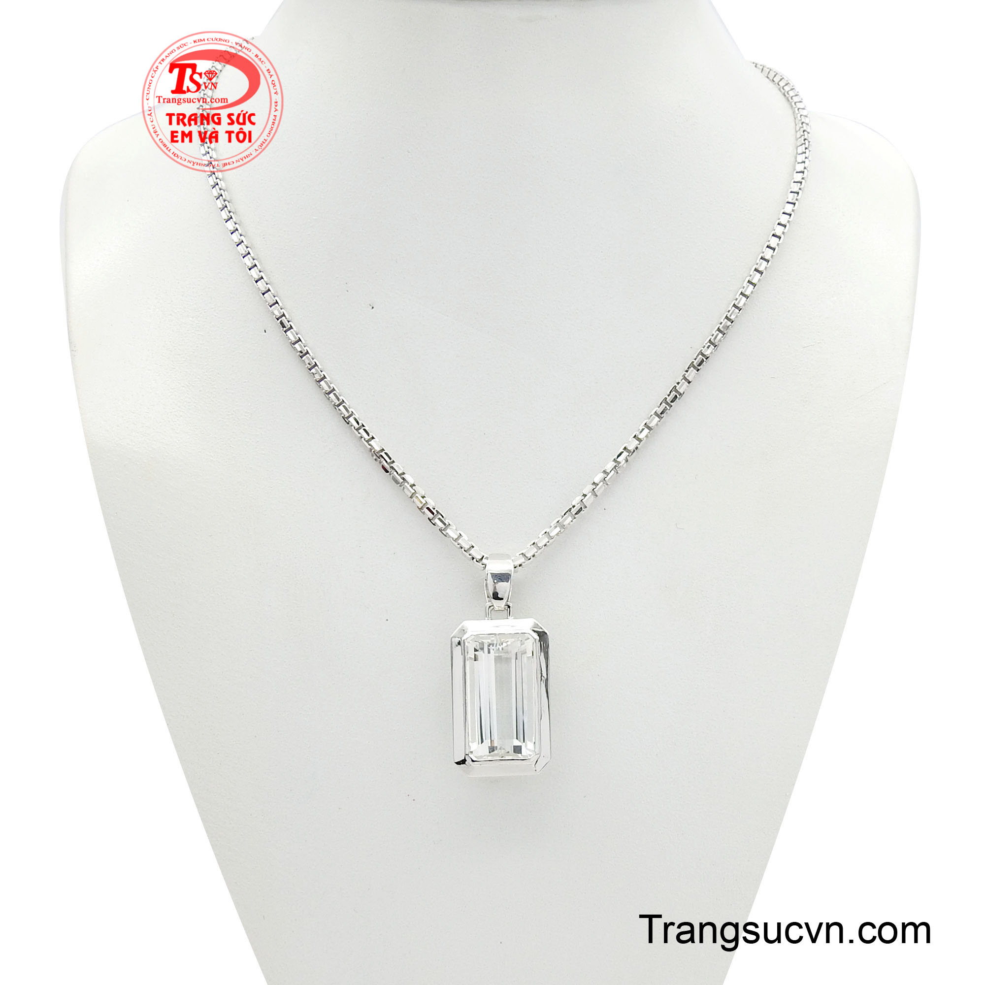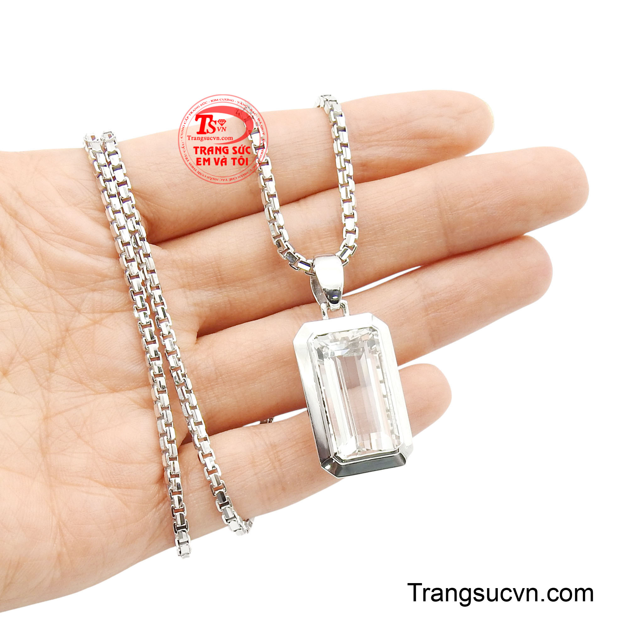 Điểm nhấn là mặt dây Topaz trắng dáng chữ nhật cắt emerald, trong suốt và sắc nét, phản chiếu ánh sáng tinh tế, toát lên vẻ sang trọng và bản lĩnh.