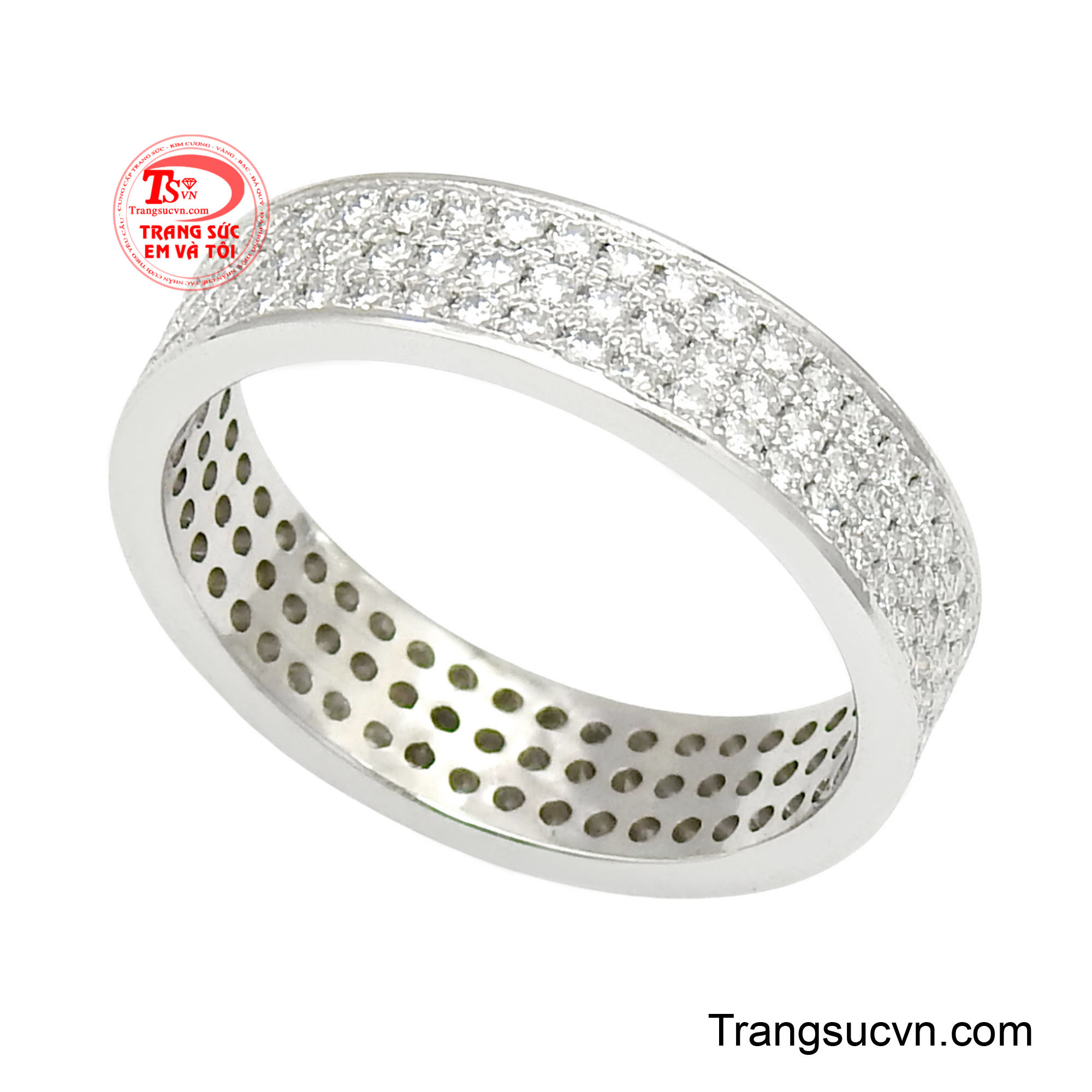 Nhẫn tinh tế vàng trắng sở hữu thiết kế thanh lịch và hiện đại, nhẫn vàng trắng nạm đá moissanite mang đến vẻ đẹp tinh tế nhưng vẫn đầy cuốn hút. Phần thân nhẫn được chế tác từ vàng trắng sáng bóng, tạo nên nền tảng hoàn hảo để tôn lên vẻ rực rỡ của những viên đá moissanite được nạm tỉ mỉ trên bề mặt. Các viên moissanite được sắp xếp thành nhiều hàng nhỏ liền mạch, tạo nên hiệu ứng lấp lánh ấn tượng dưới ánh sáng. Nhờ khả năng phản chiếu ánh sáng vượt trội, moissanite mang lại vẻ rực rỡ sang trọng không thua kém kim cương, giúp chiếc nhẫn luôn nổi bật trên tay người đeo. Mỗi viên đá đều được gắn chắc chắn, tạo nên tổng thể hài hòa, vừa tinh xảo vừa bền đẹp. Thiết kế bản nhẫn vừa vặn, ôm trọn ngón tay, mang lại cảm giác thoải mái khi đeo hằng ngày. Phần mặt trong của nhẫn được hoàn thiện cẩn thận với các lỗ thoáng giúp giảm trọng lượng và tăng sự thông thoáng, đồng thời làm nổi bật kỹ thuật chế tác tinh xảo của sản phẩm.