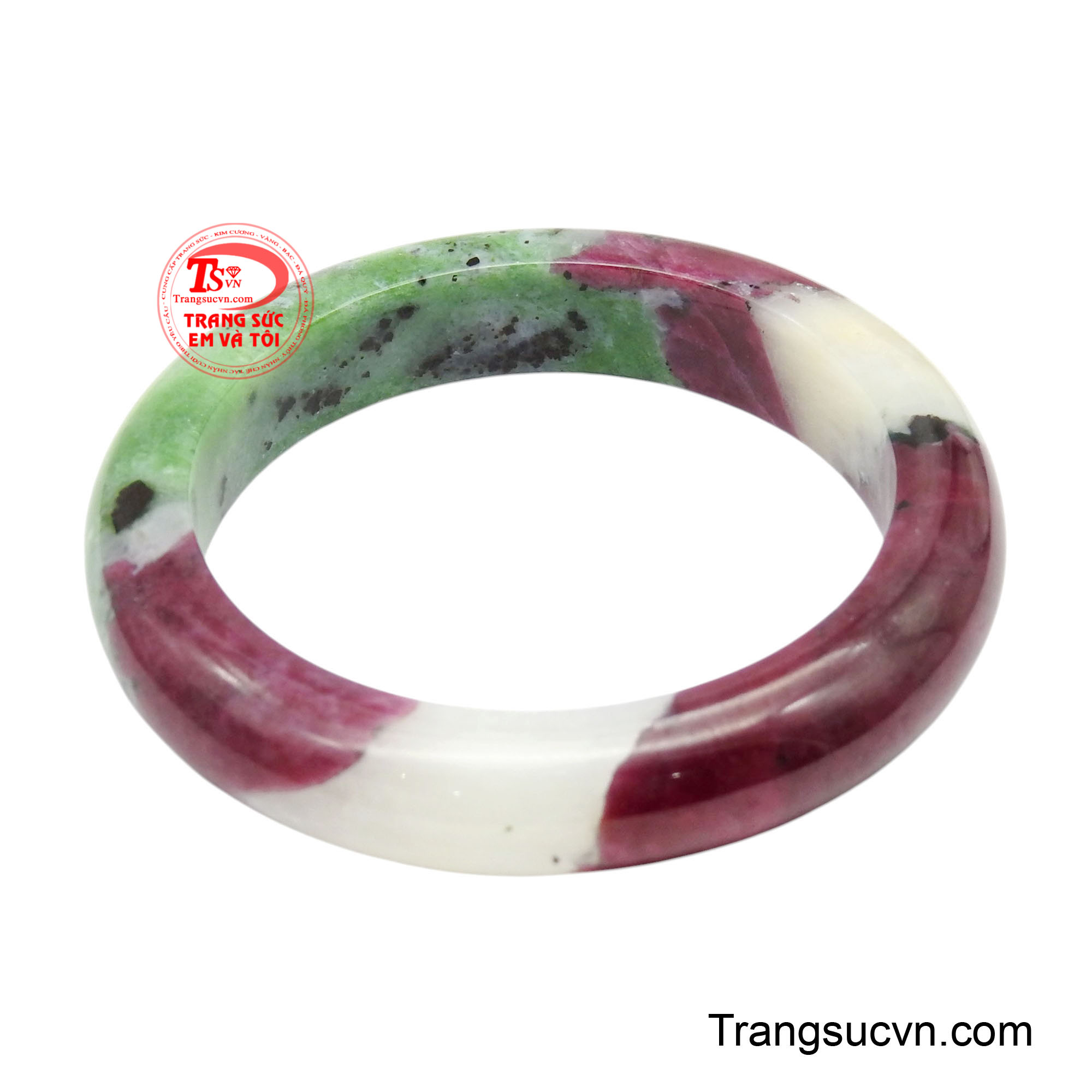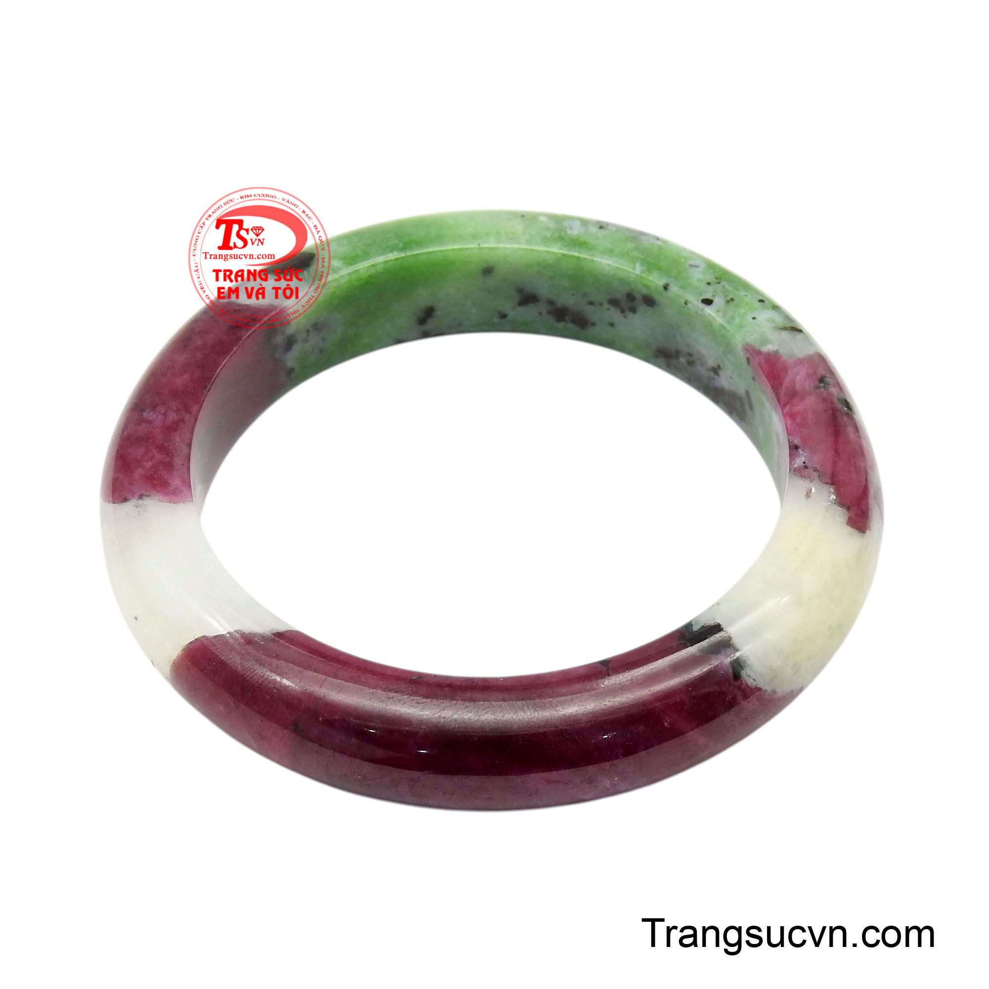 Vòng tay ruby tam sắc thiên ngọc là kiệt tác hội tụ linh khí trời đất, là hiện thân trọn vẹn của vẻ đẹp ấy. Ngay từ ánh nhìn đầu tiên, chiếc vòng cuốn hút bởi sự kết hợp đầy kỳ diệu của ba gam màu tự nhiên: đỏ mang biểu tượng của quyền lực, đam mê và tài lộc, xanh đại diện cho sinh khí, phát triển và bình an, trắng hiện thân của sự thuần khiết, cân bằng và thanh lọc năng lượng. Ba sắc thái tưởng chừng đối lập, nhưng khi hội tụ trên cùng một khối ngọc lại hòa quyện một cách tinh tế, tạo nên một tổng thể vừa nổi bật, vừa hài hòa như một bức tranh thiên nhiên sống động được chạm khắc bởi tạo hóa. Bề mặt vòng được đánh bóng mịn hoàn hảo, mang lại cảm giác trơn mát khi chạm vào, đồng thời giúp ánh sáng phản chiếu nhẹ nhàng, làm nổi bật chiều sâu của viên đá. Khi đeo lên tay, chiếc vòng không chỉ tôn da mà còn tạo nên một điểm nhấn đầy tinh tế sang trọng nhưng không phô trương.