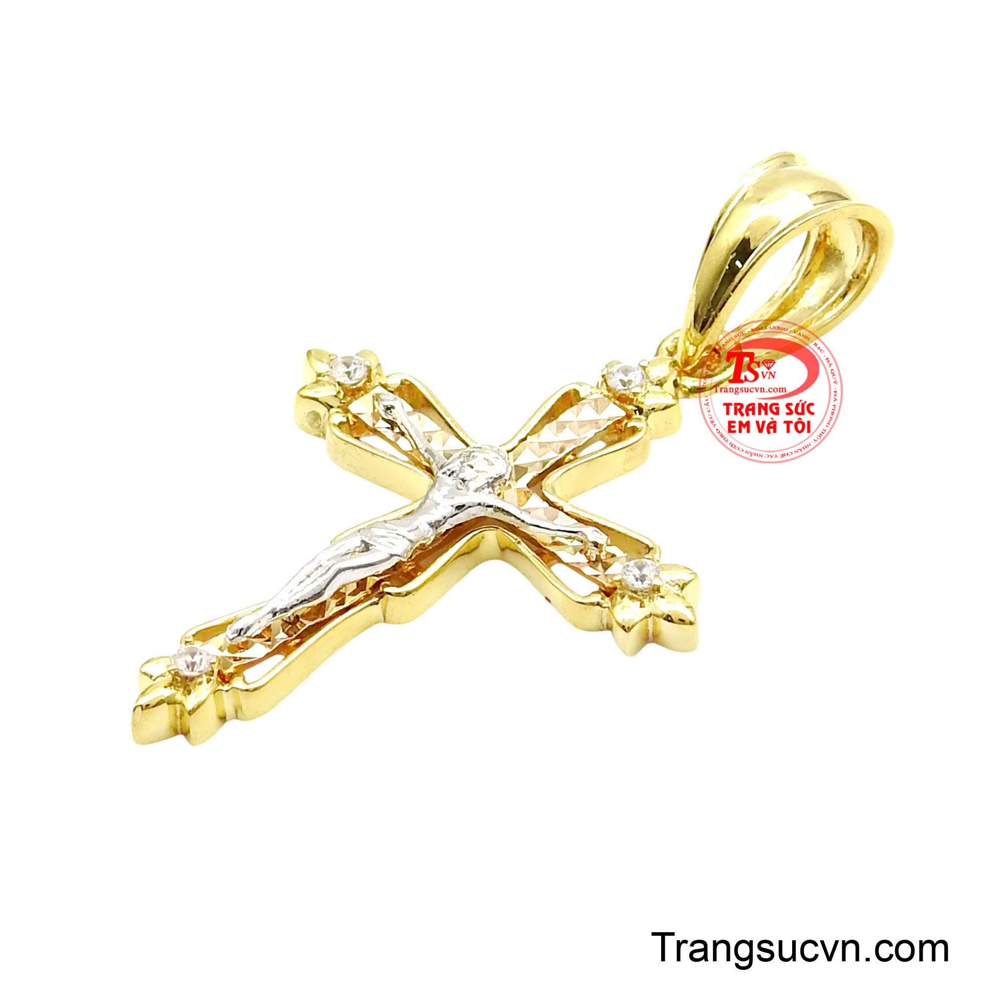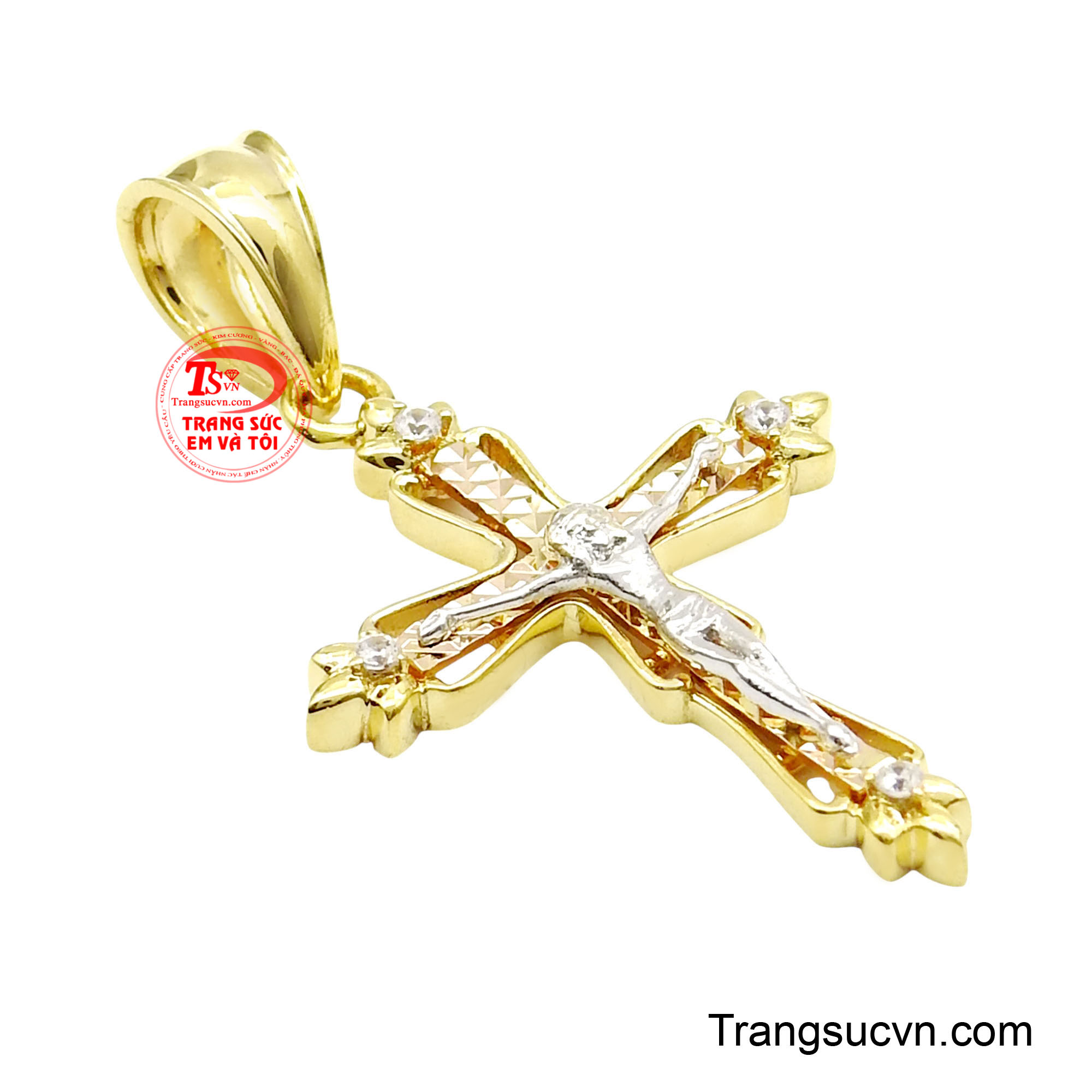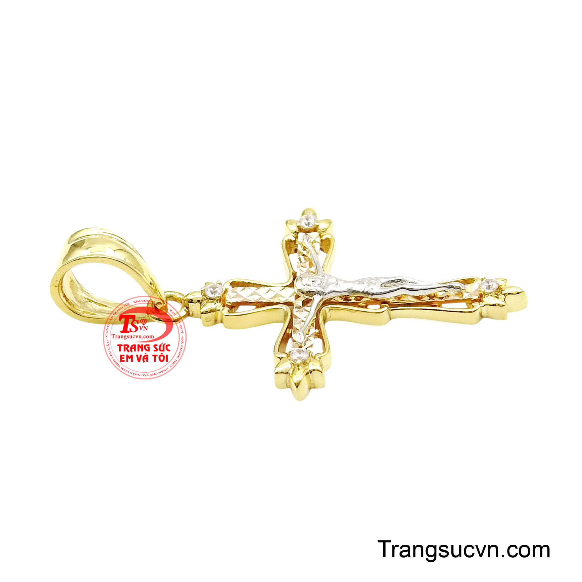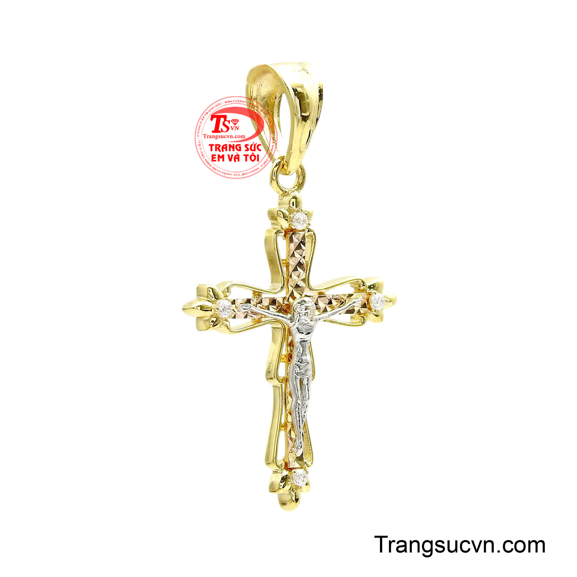 Mặt thánh giá vàng ban phước là hiện thân của niềm tin thiêng liêng, mang ý nghĩa bảo hộ, dẫn lối và ban phước lành cho người đeo. Thiết kế tinh xảo với hình ảnh Chúa Giêsu trên thánh giá được chế tác nổi bật, tạo nên vẻ trang nghiêm nhưng vẫn toát lên sự thanh thoát và cao quý. Điểm nhấn đặc biệt nằm ở phần thân thánh giá được xử lý bề mặt cắt giác tinh vi, phản chiếu ánh sáng lấp lánh tự nhiên, kết hợp cùng các viên đá nhỏ đính tại bốn góc thánh giá tượng trưng cho ánh sáng đức tin lan tỏa bốn phương. Sự kết hợp 3 chất liệu vàng màu khác nhau tạo chiều sâu thẩm mỹ, giúp tổng thể trở nên sang trọng và bền vững theo thời gian. Sản phẩm tôn vinh đức tin, phù hợp cho người theo đạo Công giáo hoặc những ai trân trọng giá trị tinh thần. Thích hợp làm quà tặng trong các dịp đặc biệt như rửa tội, thêm sức, sinh nhật hoặc lễ trọng.