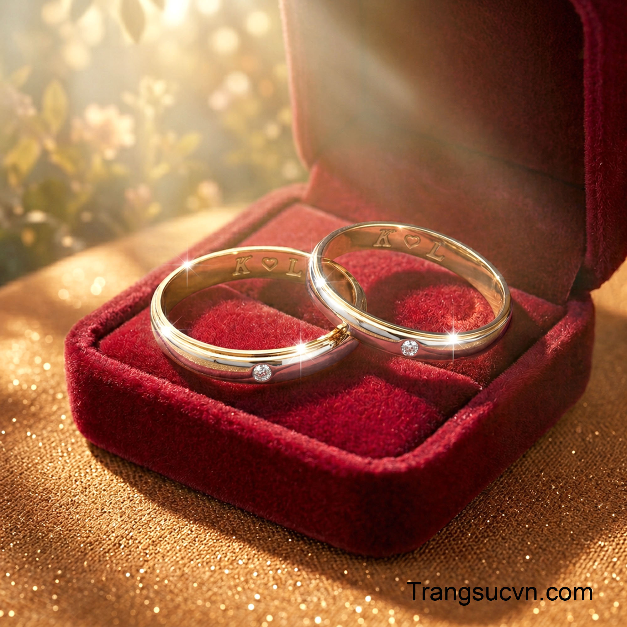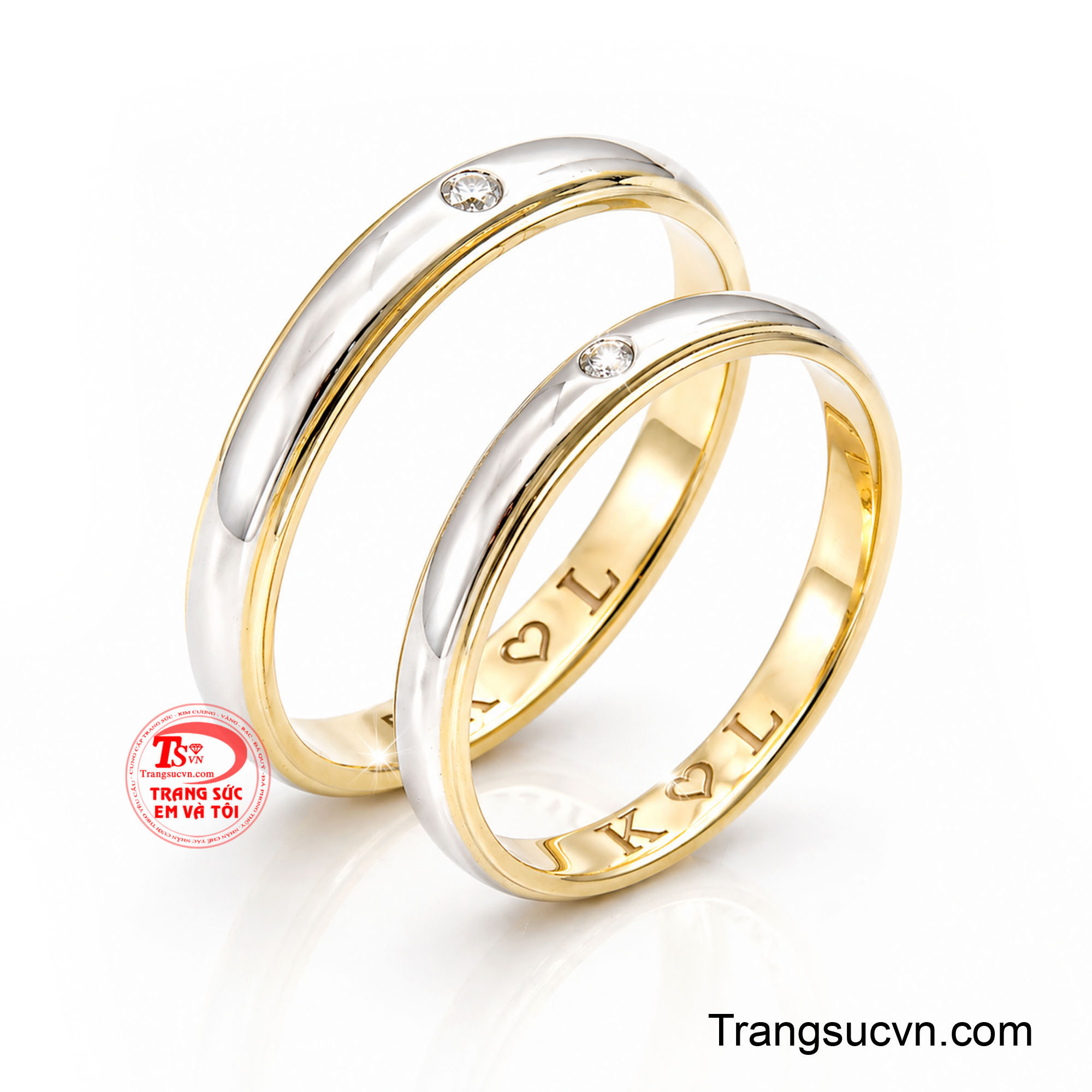 Nhẫn cưới sang trọng tinh tế hiện lên với vẻ đẹp sang trọng nhờ thiết kế tối giản nhưng đầy cuốn hút. Hai chiếc nhẫn được chế tác từ vàng ánh kim kết hợp cùng dải sắc trắng sáng, tạo nên sự tương phản hài hòa và hiện đại. Bề mặt nhẫn trơn mịn, phản chiếu ánh sáng nhẹ nhàng, điểm xuyết một viên đá nhỏ lấp lánh như nét chấm phá tinh xảo, không phô trương nhưng đủ để thu hút ánh nhìn. Bên trong mỗi chiếc nhẫn khắc dòng tên cặp đôi, mang ý nghĩa cá nhân hóa sâu sắc, biểu tượng của tình yêu riêng biệt và gắn kết bền lâu. Tổng thể thiết kế toát lên sự thanh lịch, tinh giản nhưng không kém phần đẳng cấp, phù hợp với những cặp đôi yêu thích vẻ đẹp hiện đại, nhẹ nhàng mà vẫn chứa đựng giá trị vĩnh cửu của tình yêu.