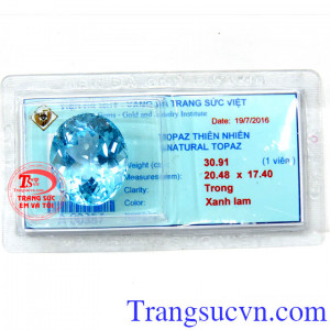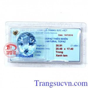 Viên topaz thiên nhiên bản to 30.91 ct đẹp đảm bảo chất lượng,có giấy kiểm định kèm theo từng viên Topaz màu xanh lam,phù hợp mệnh thủy,mệnh mộc,đeo mang lại may mắn,trí tâm an tịnh, hợp thời trang,Đảm bảo Uy tín nhiều năm