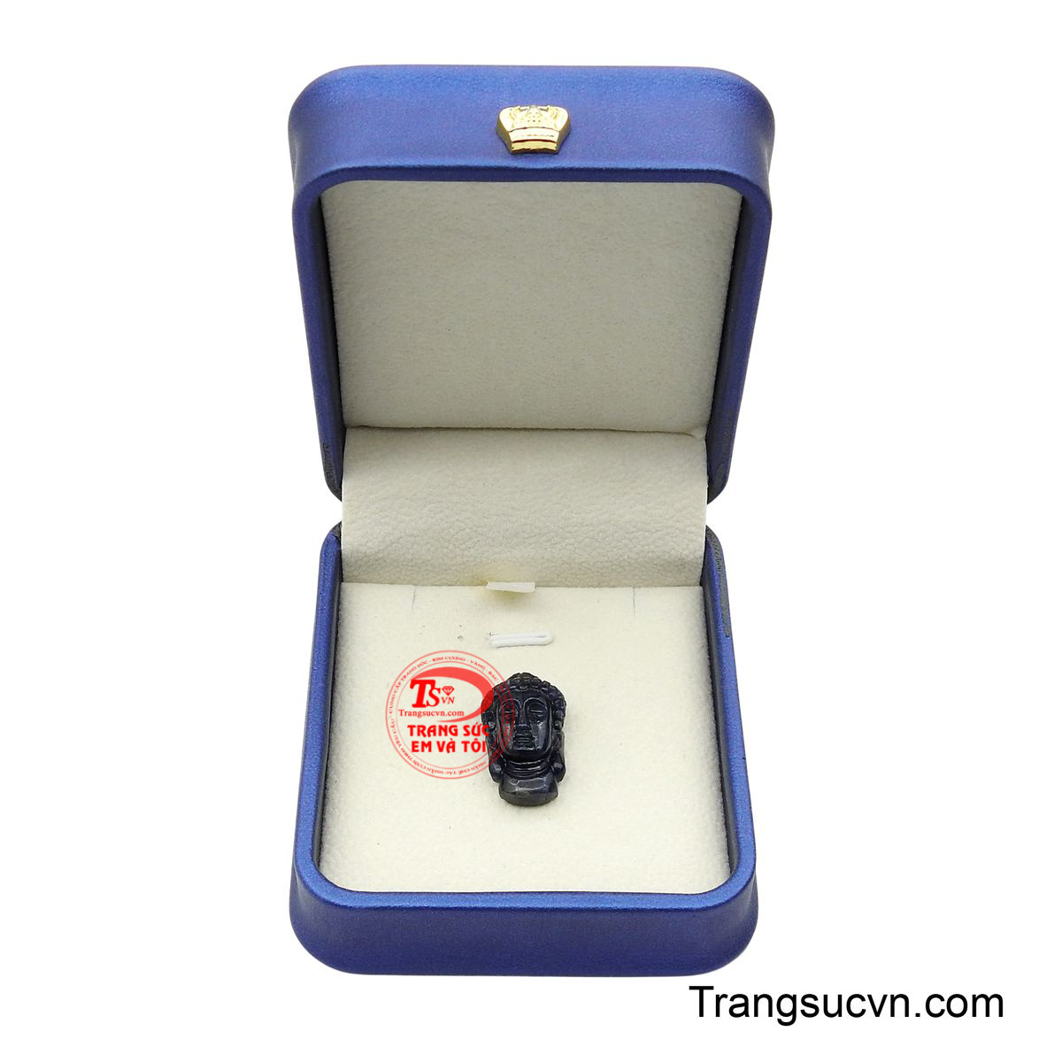 Mặt dây được chế tác trên nền đá Sapphire xanh lam thẳm, mang lại vẻ đẹp trang nghiêm, thoát tục.