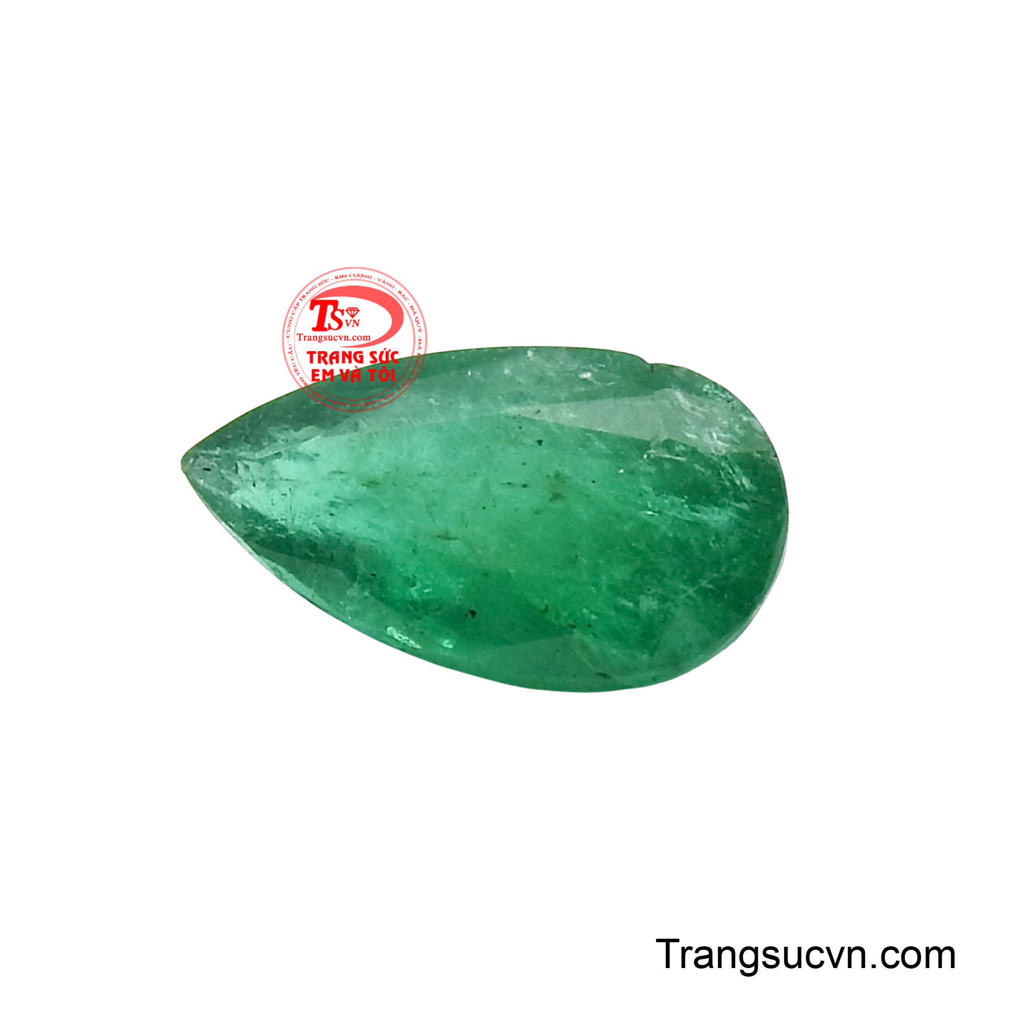 Bề mặt viên đá được mài giác tinh xảo, các mặt cắt phản chiếu ánh sáng dịu nhẹ, làm nổi bật sắc xanh lục tự nhiên xen lẫn những bao thể đặc trưng của Emerald thiên nhiên