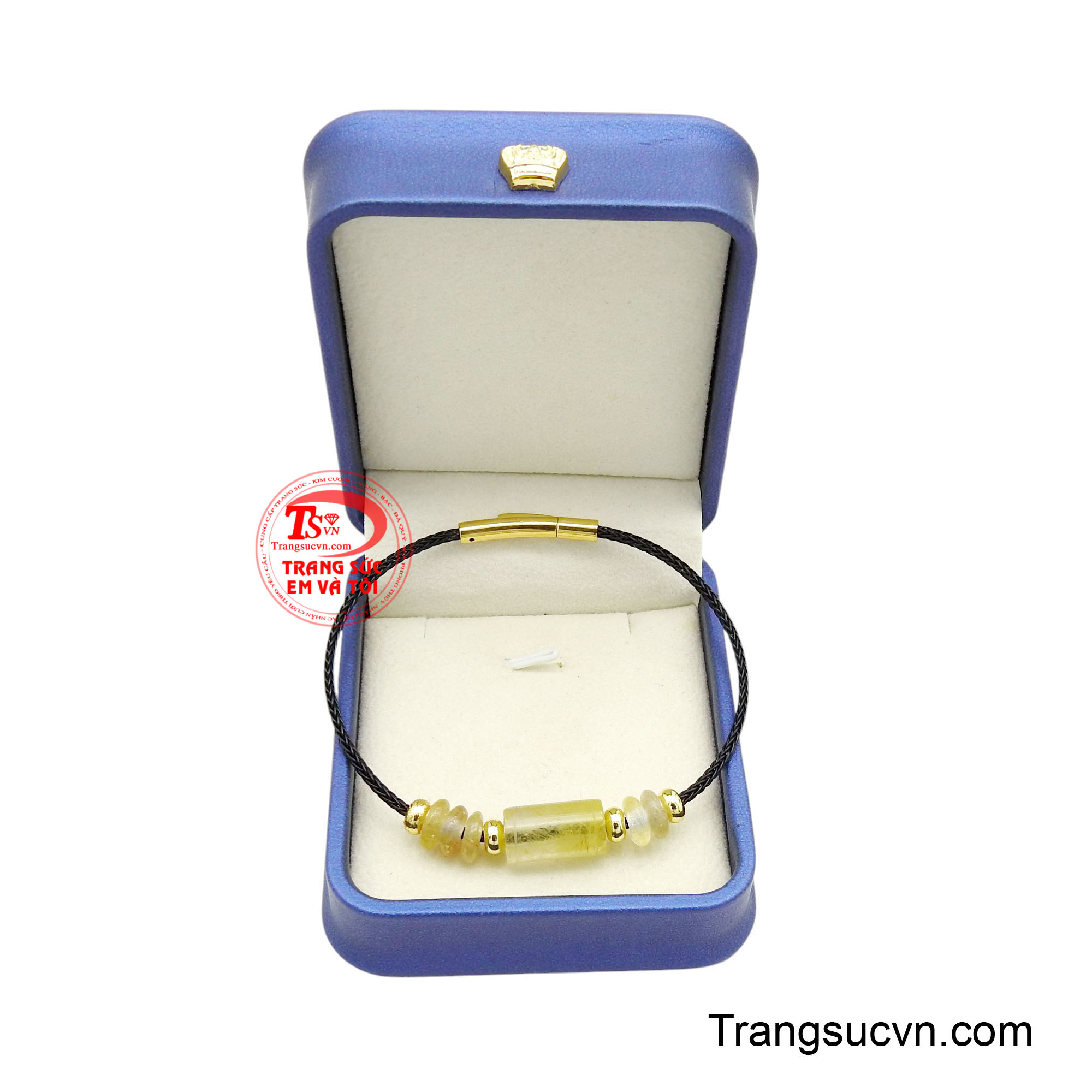 Phần dây vòng được thiết kế dạng dây bện chắc chắn, kết hợp khóa kim loại tông vàng tinh tế, giúp chiếc vòng vừa bền đẹp vừa dễ dàng sử dụng trong sinh hoạt hằng ngày.
