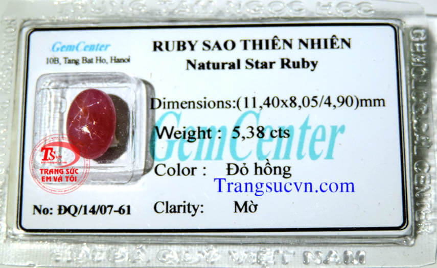 Tên đá quý: Ruby sao thiên nhiên ( Natural star ruby) Hồng ngọc sao